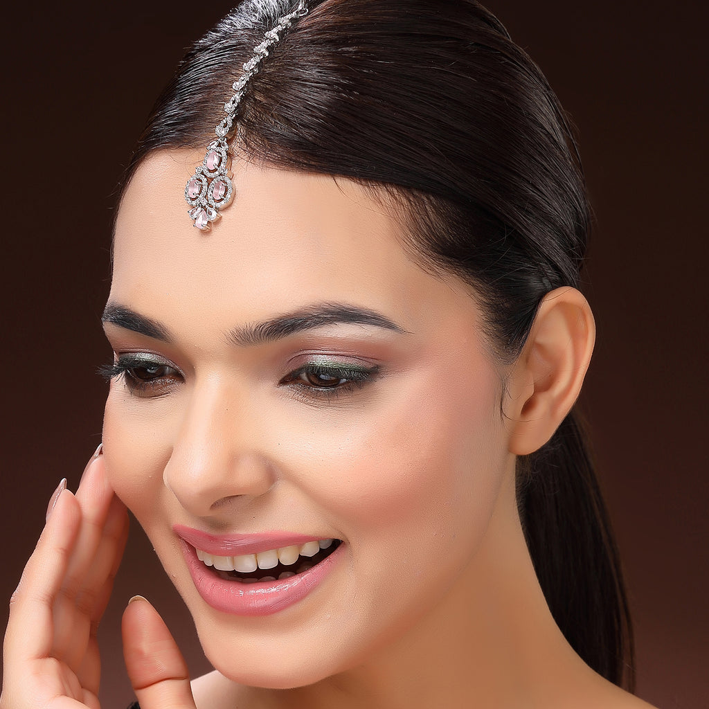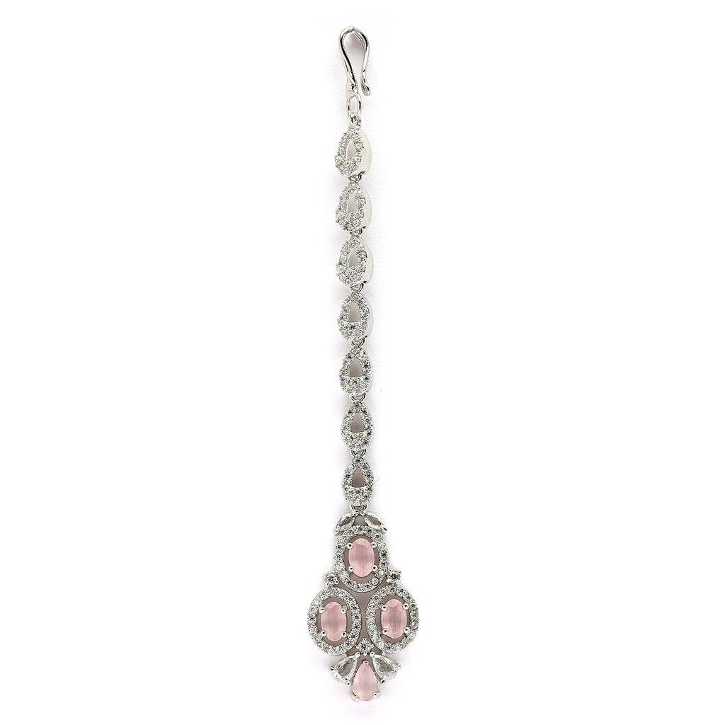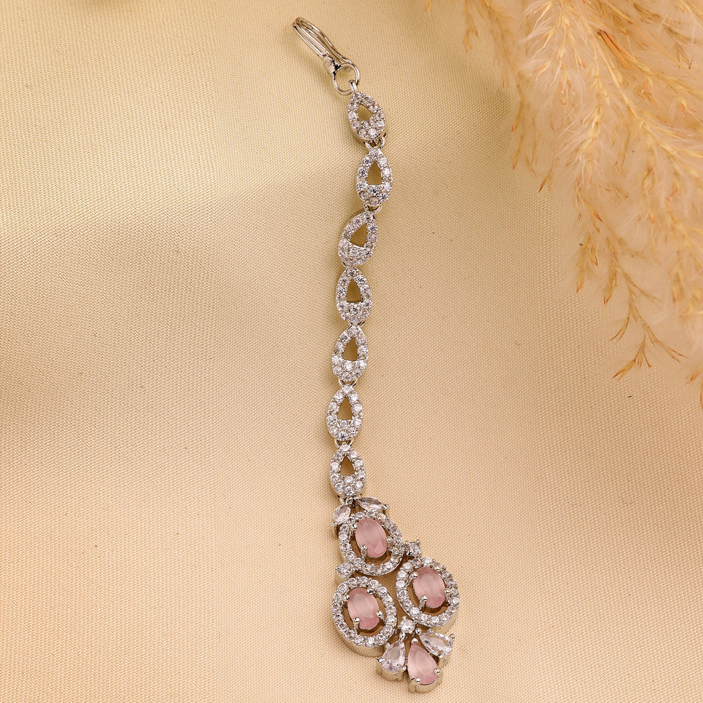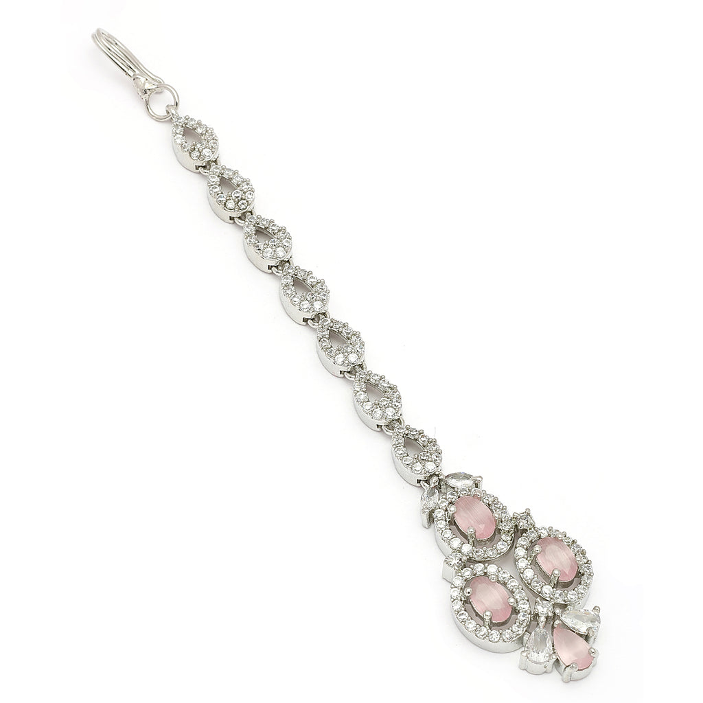 Rhodium Plated Silver Toned Pink & White American Diamond Studded Maang Tikka