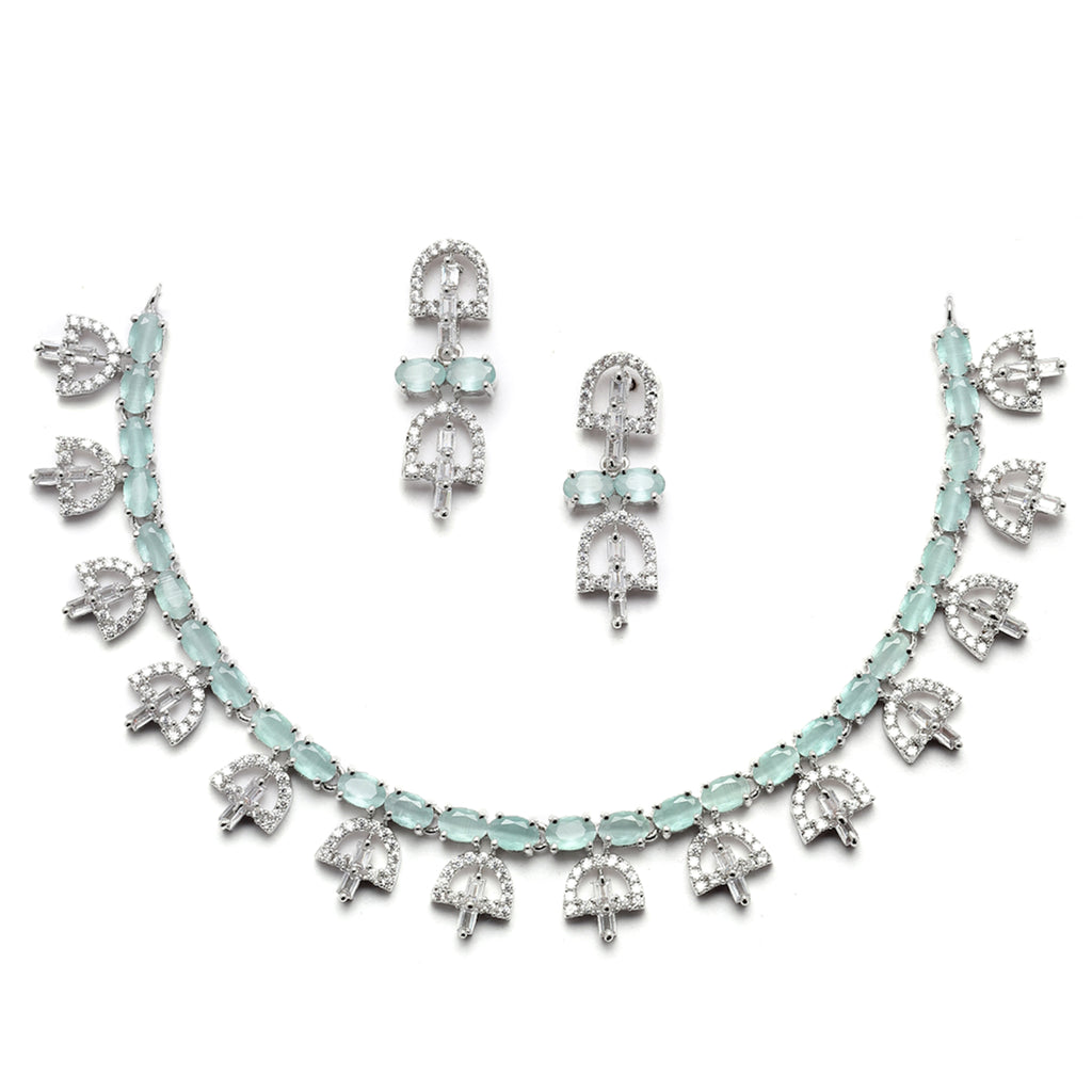 Rhodium-Plated Silver Toned Rectangle Sea Green American Diamond Studded Necklace Earrings Jewellery Set
