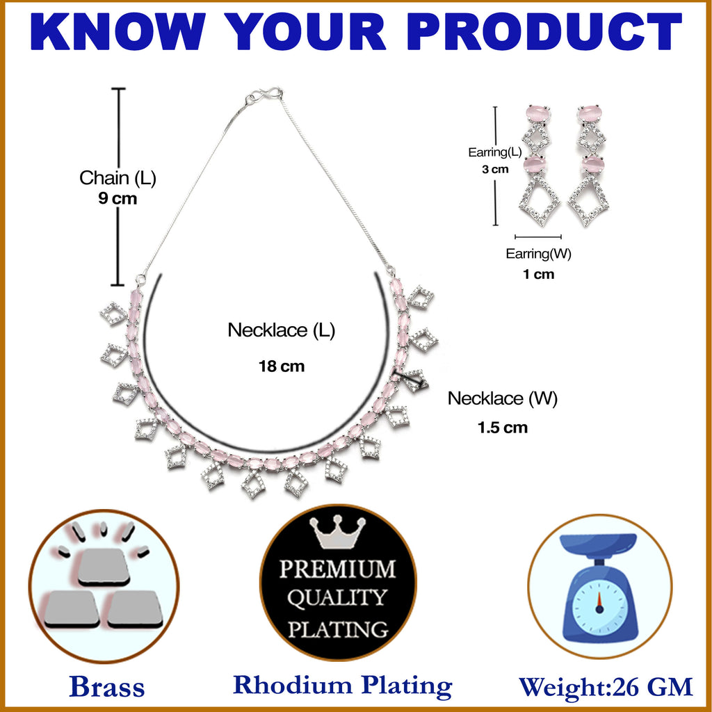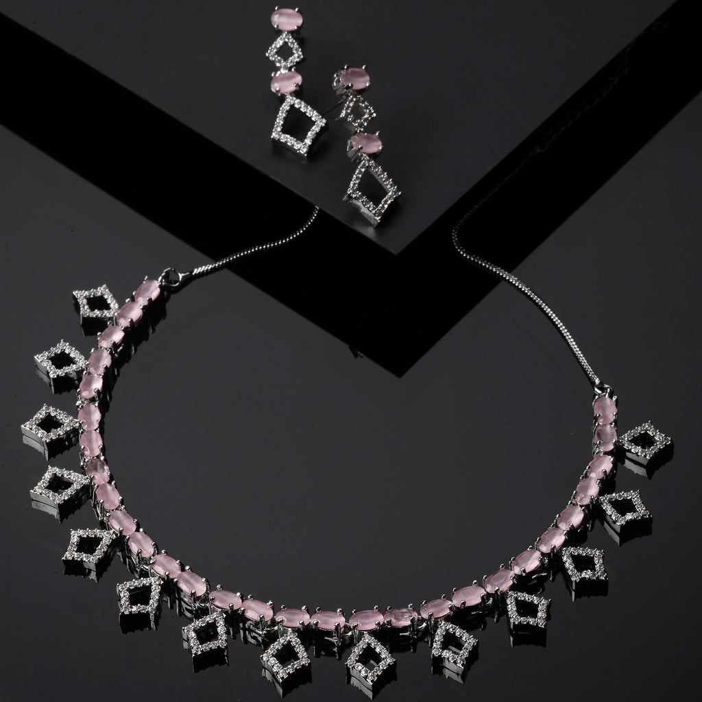 Rhodium-Plated Silver Toned Rectangle Pink American Diamond Studded Necklace Earrings Jewellery Set