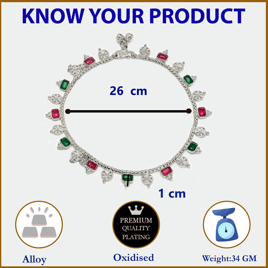 Rhodium Plated Silver Toned Rectangle Red White Green Cubic Zirconia Studded Anklets
