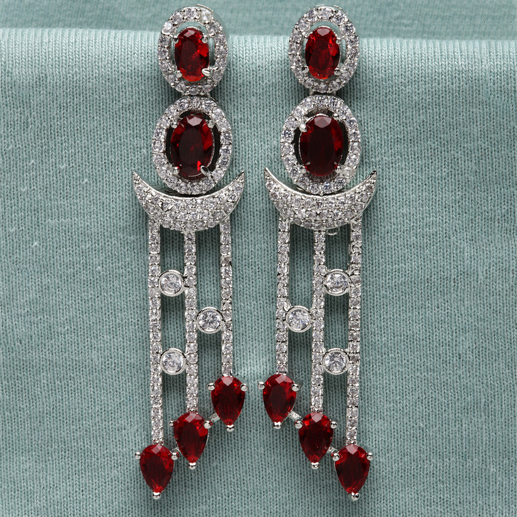Rhodium-Plated Silver Toned Red & White American Diamond studded Crescent Shaped Drop Earrings