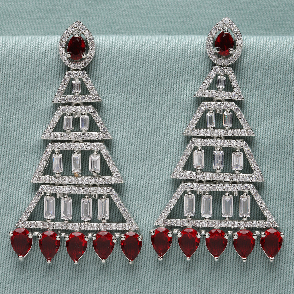 Rhodium-Plated with Silver Toned Red & White triangular shape drop earrings, has American Diamond studded secured with a post and back.