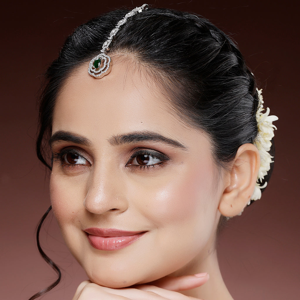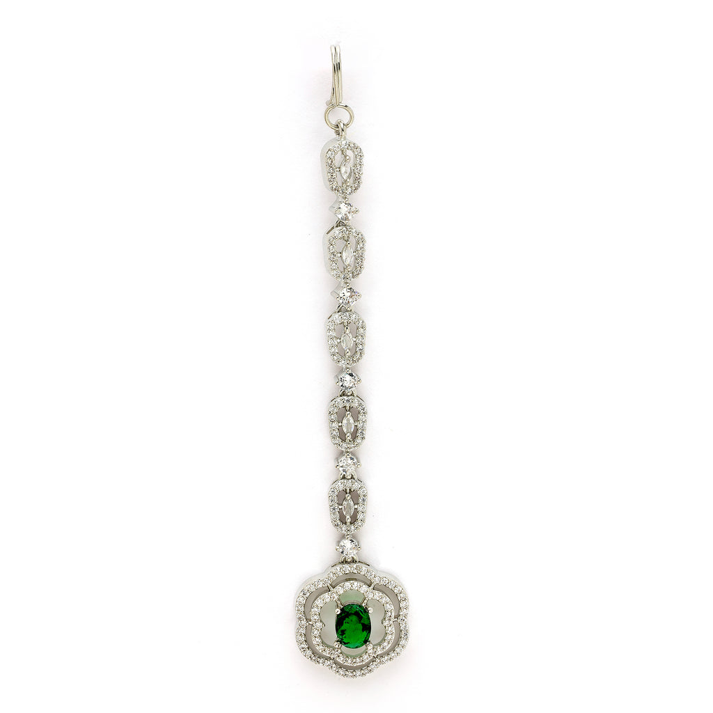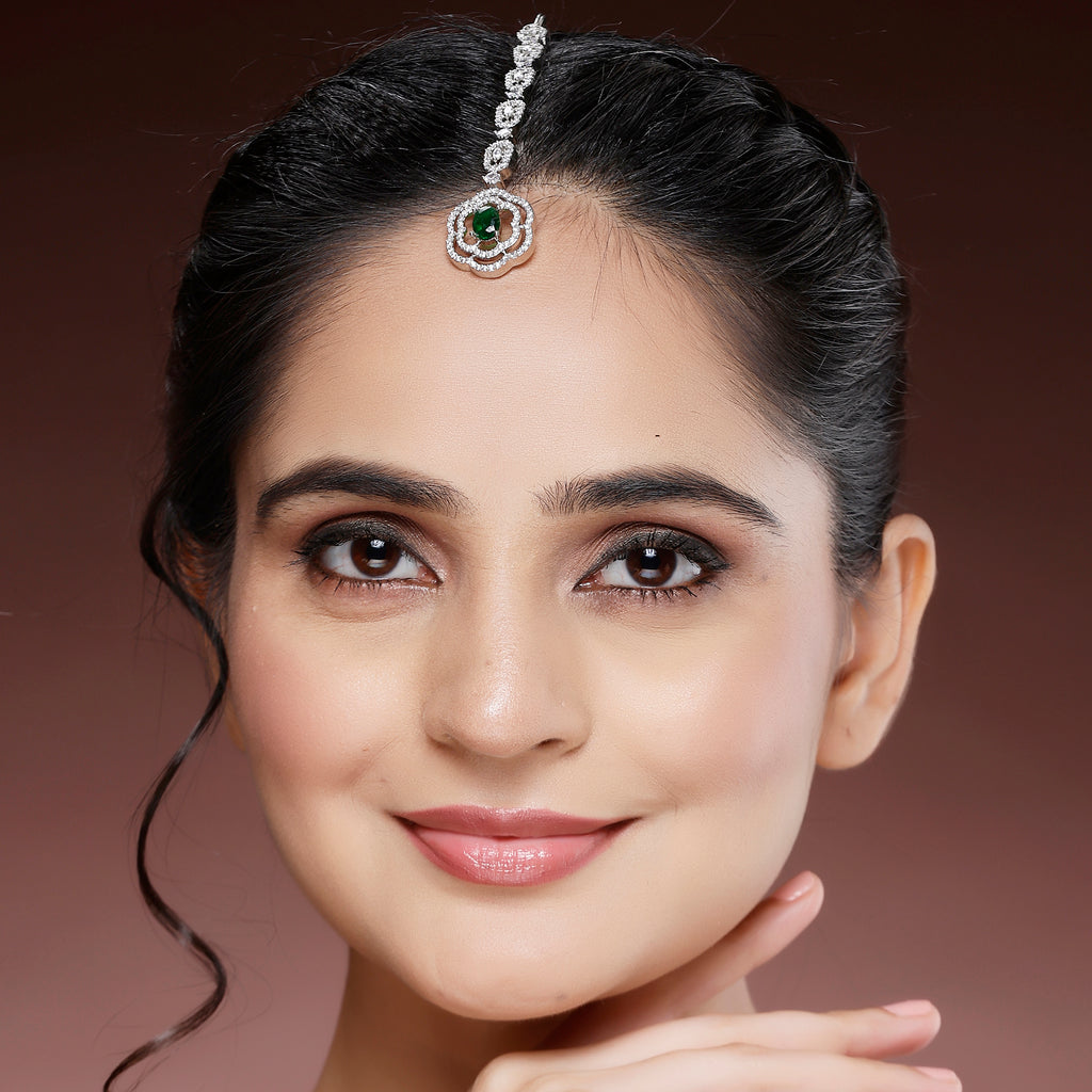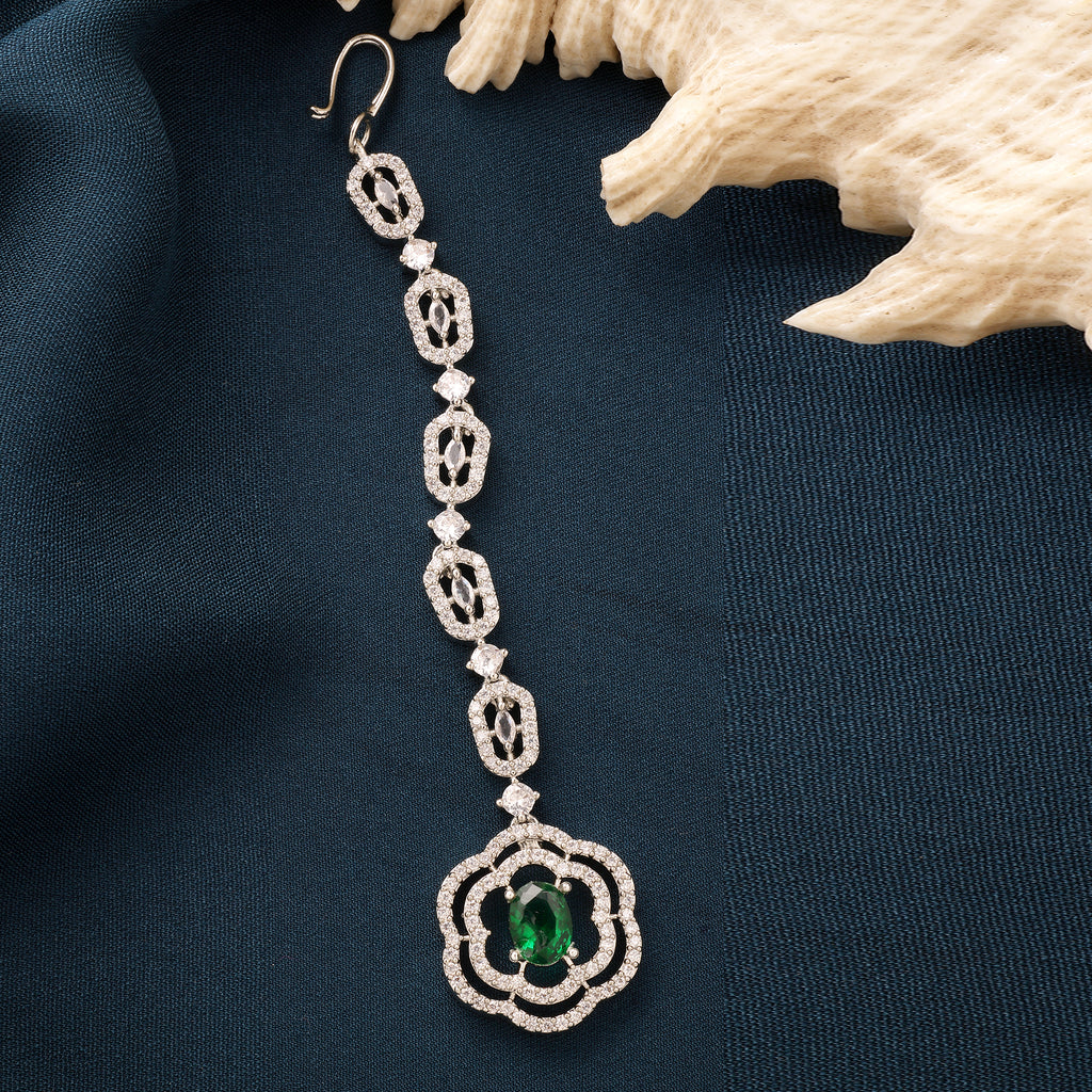 Rhodium Plated Silver Toned Round Floral Green American Diamond Studded Maang Tikka