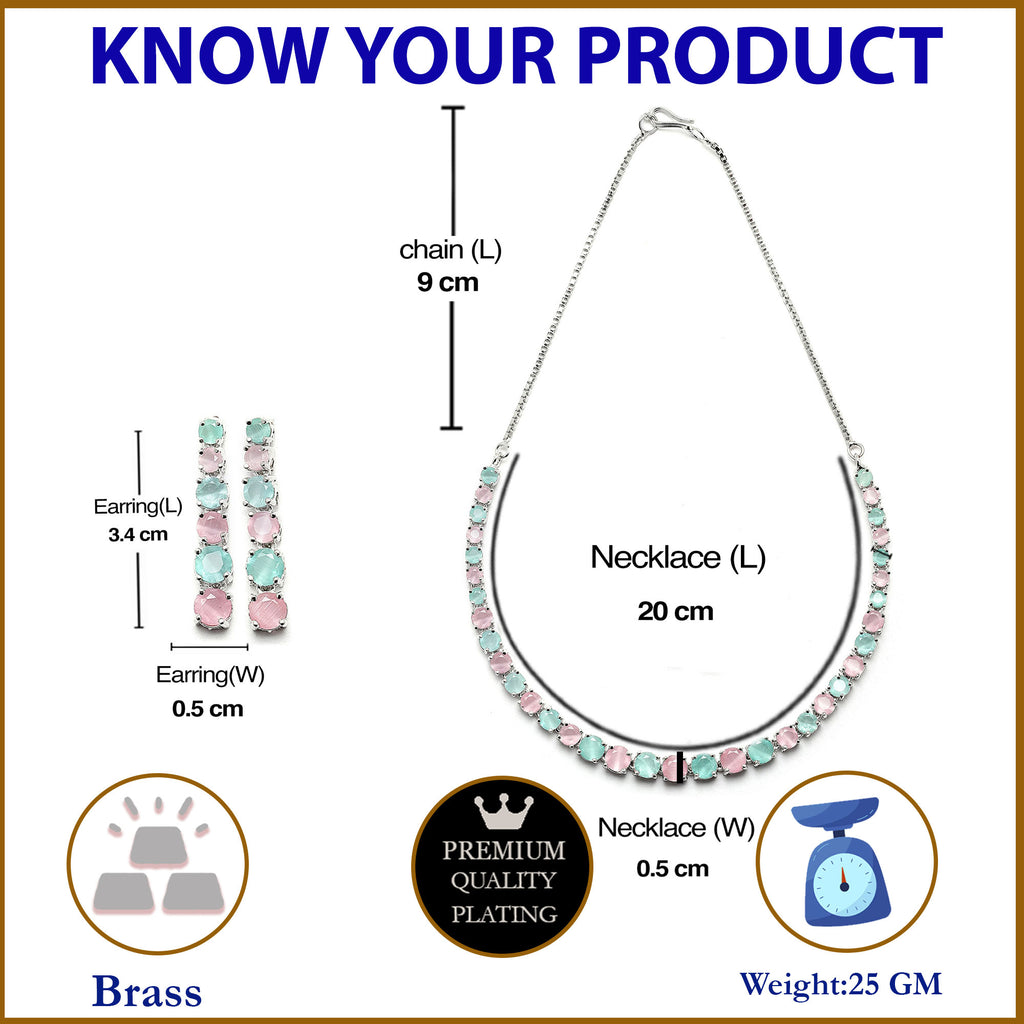Rhodium-Plated Silver Toned Round Pink & Sea Green American Diamond Studded Necklace Earrings Jewellery Set