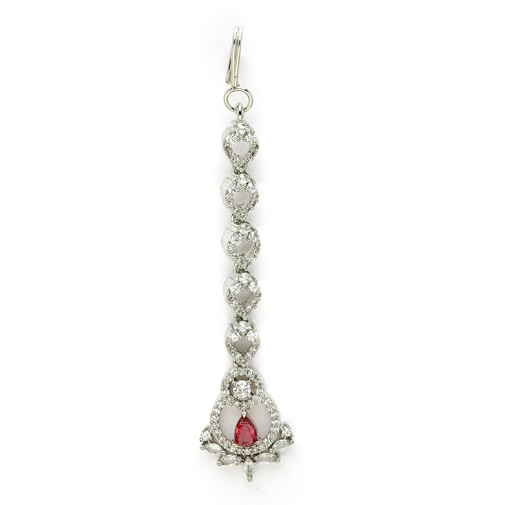Rhodium Plated Silver Toned Round & Teardrop Shaped Red American Diamond Studded Maang Tikka
