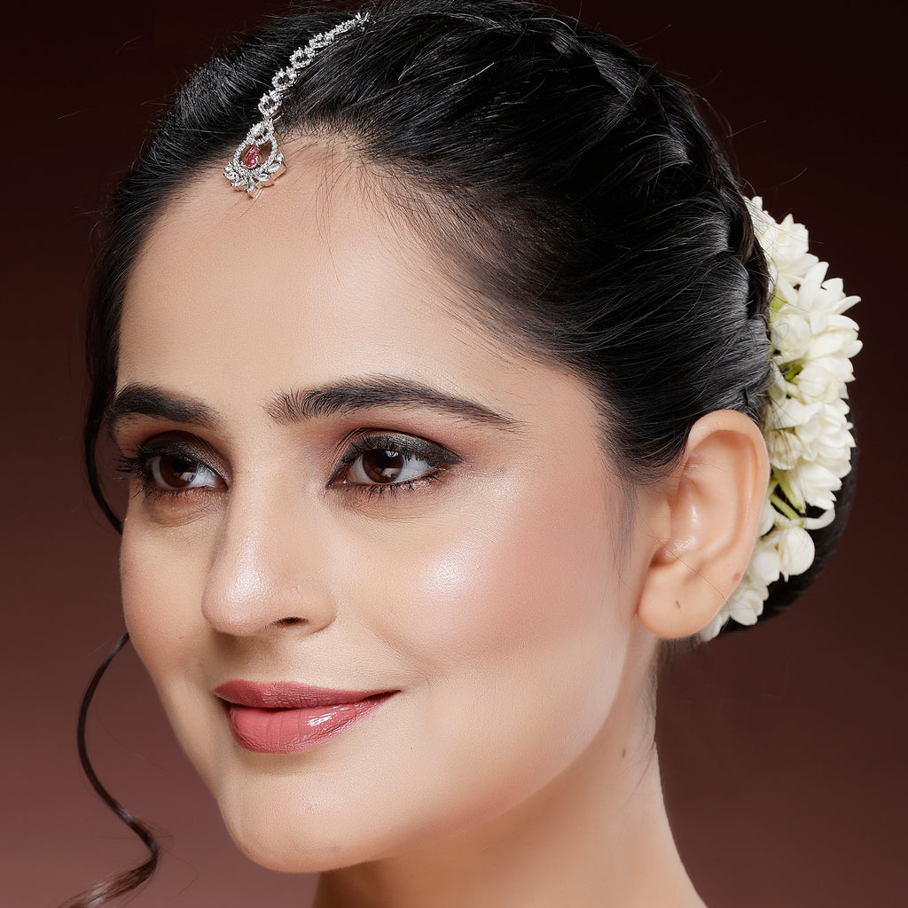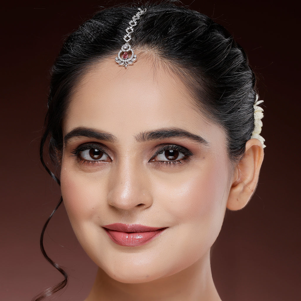 • Elegant Design: This rhodium-plated Maang Tikka features a graceful pattern with sparkling stones, adding a touch of elegance to any look.