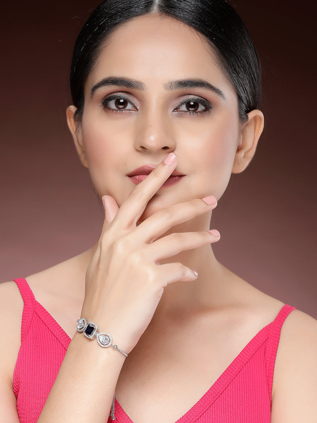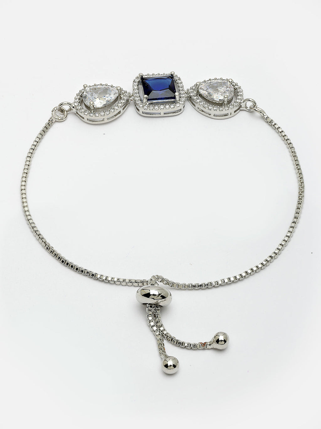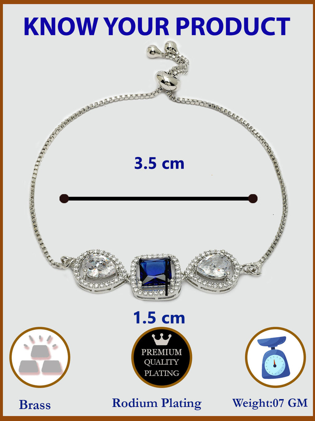 Elegant Design: Rhodium-plated wraparound bracelet adorned with square blue & white teardrop-shaped American diamonds for a sophisticated and glamorous look.