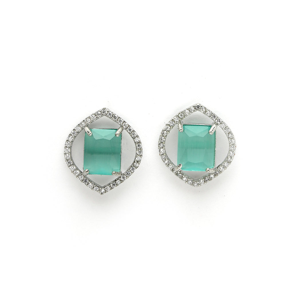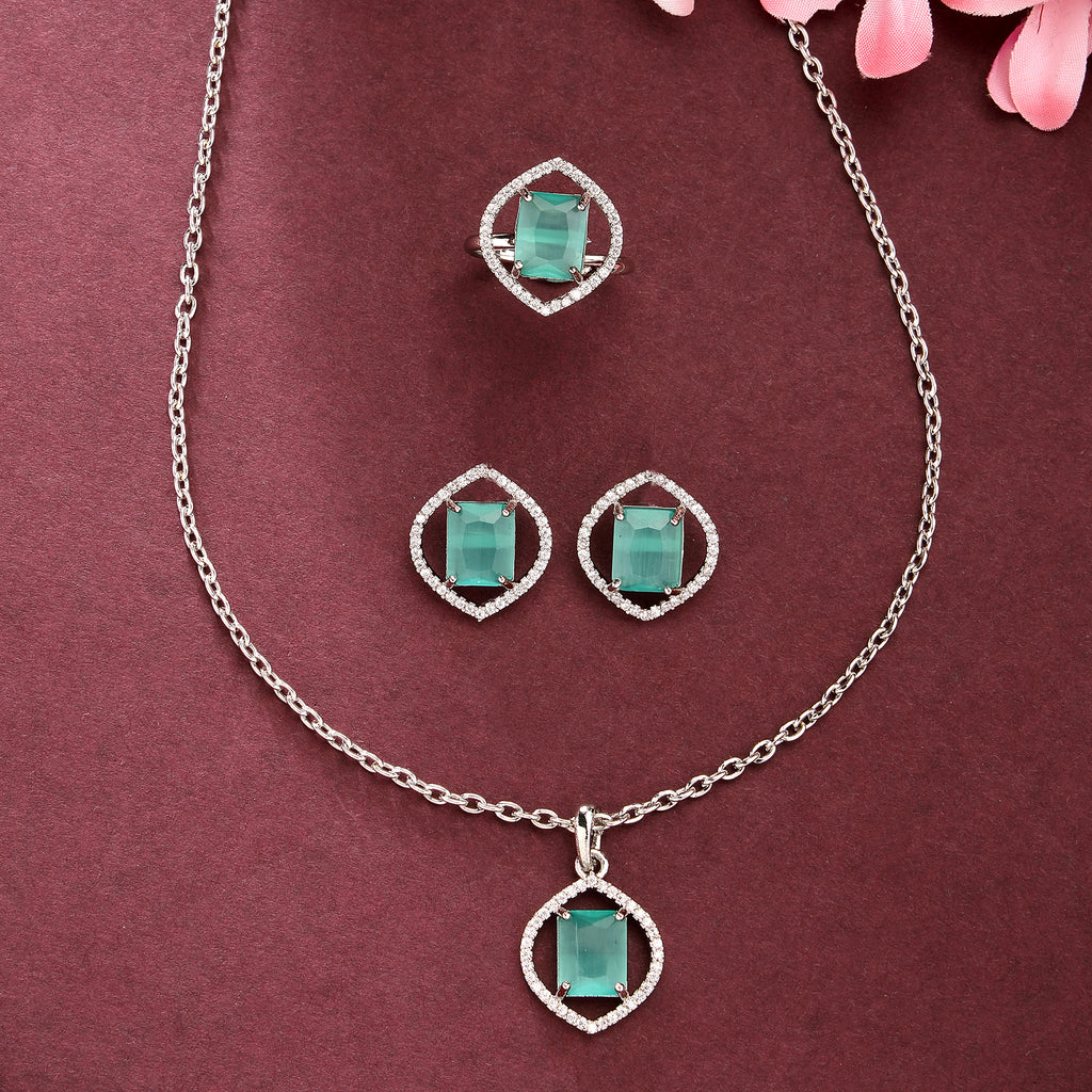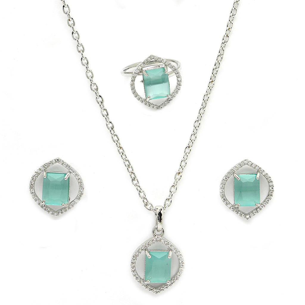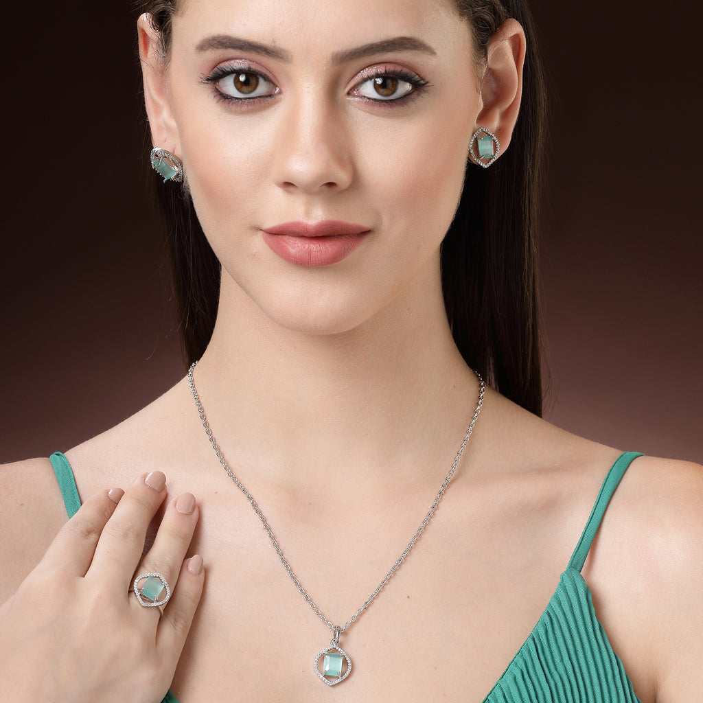 Elegant Design : This rhodium-plated with Sea Blue gemstone at its core for a harmonized and stylish look. Surrounding the gemstone is a halo of shimmering white stones, adding a touch of brilliance and sophistication