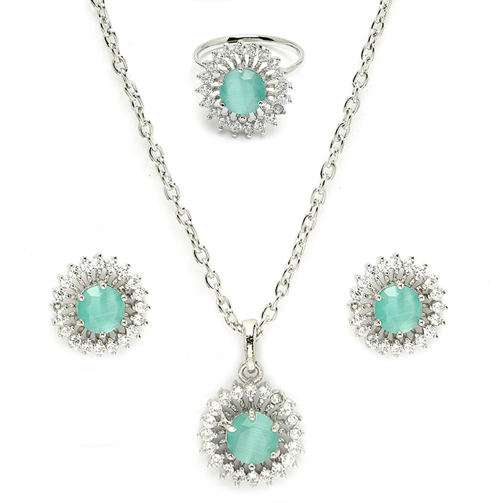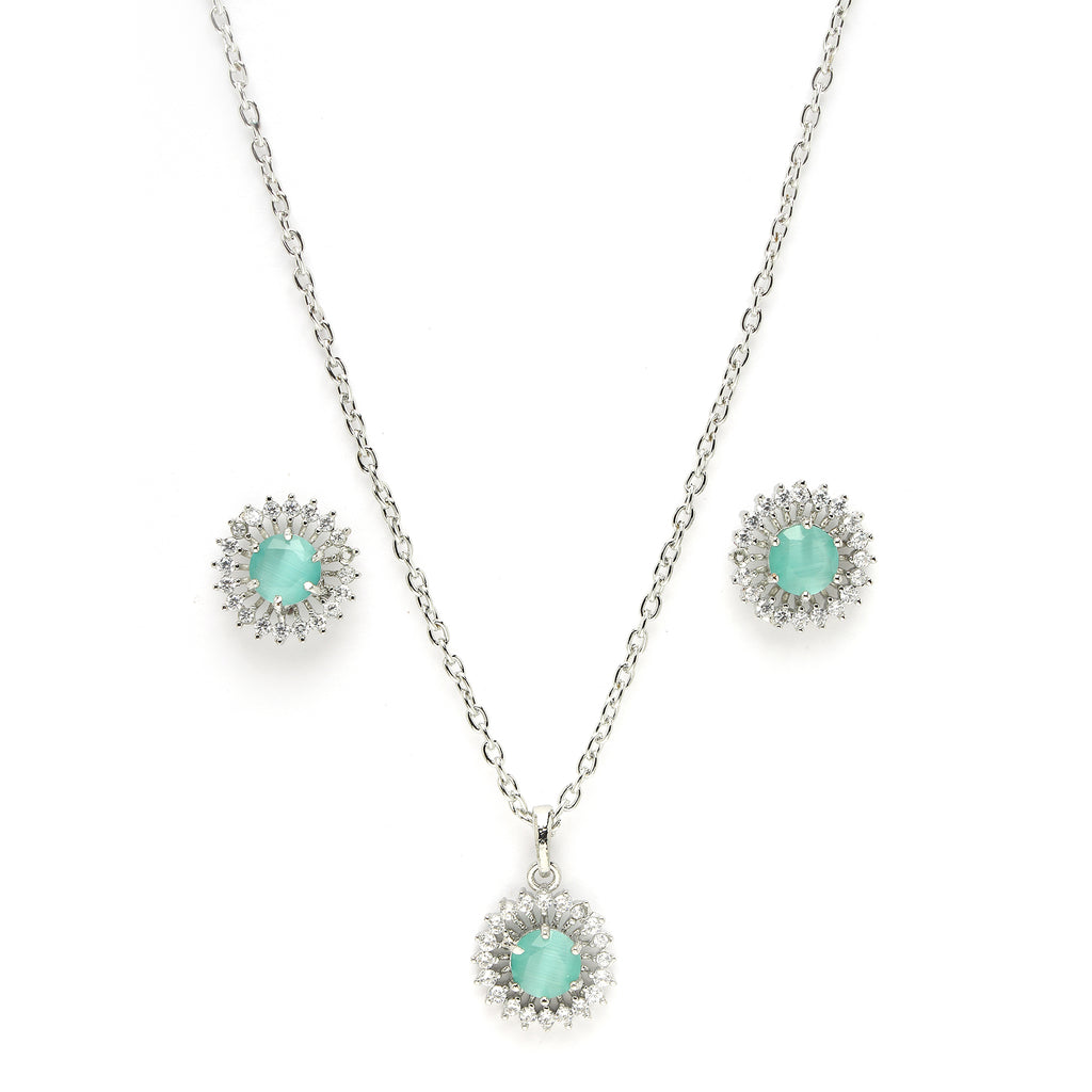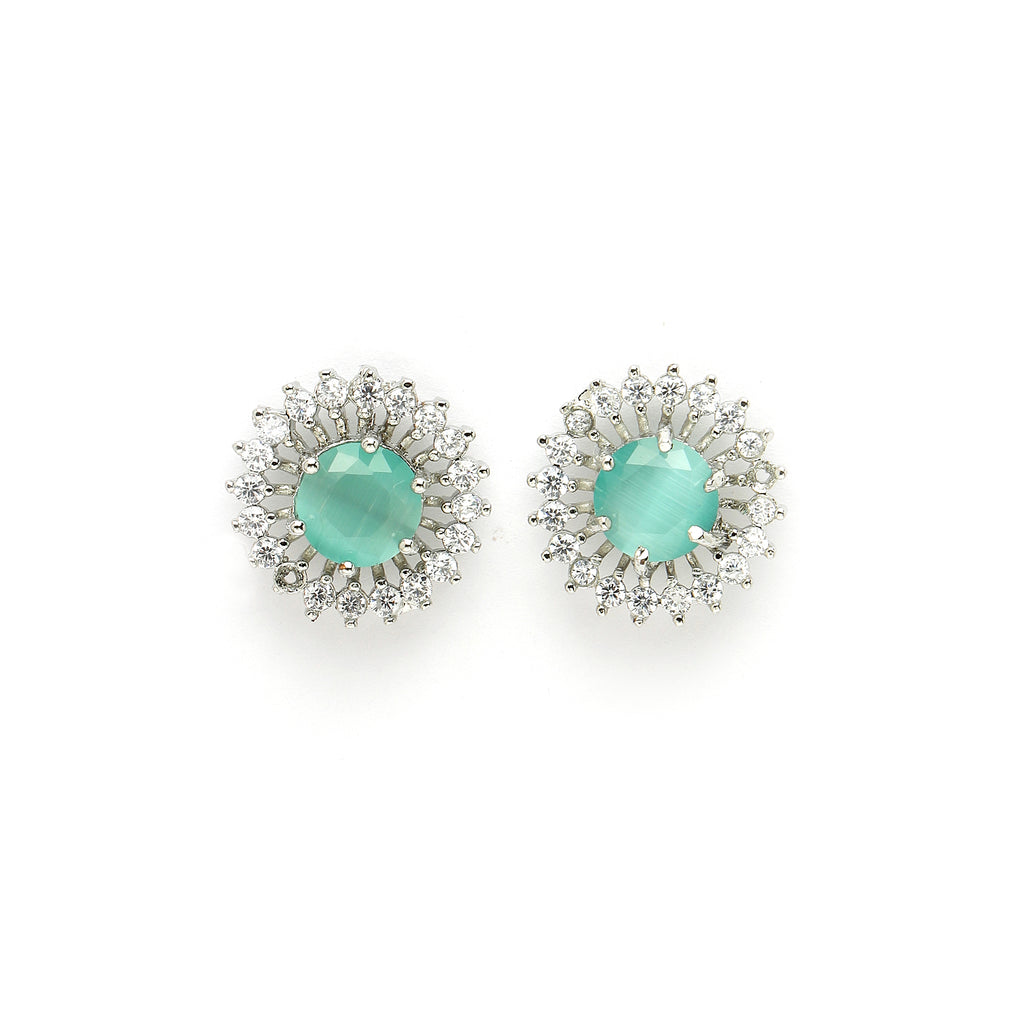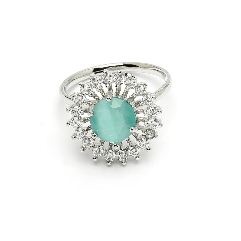 Elegant Design : This rhodium-plated with Sea Blue gemstone at its core for a harmonized and stylish look. Surrounding the gemstone is a halo of shimmering white stones, adding a touch of brilliance and sophistication