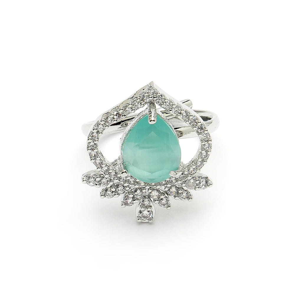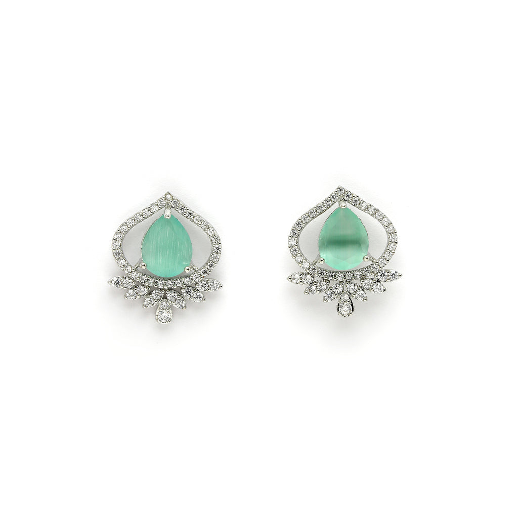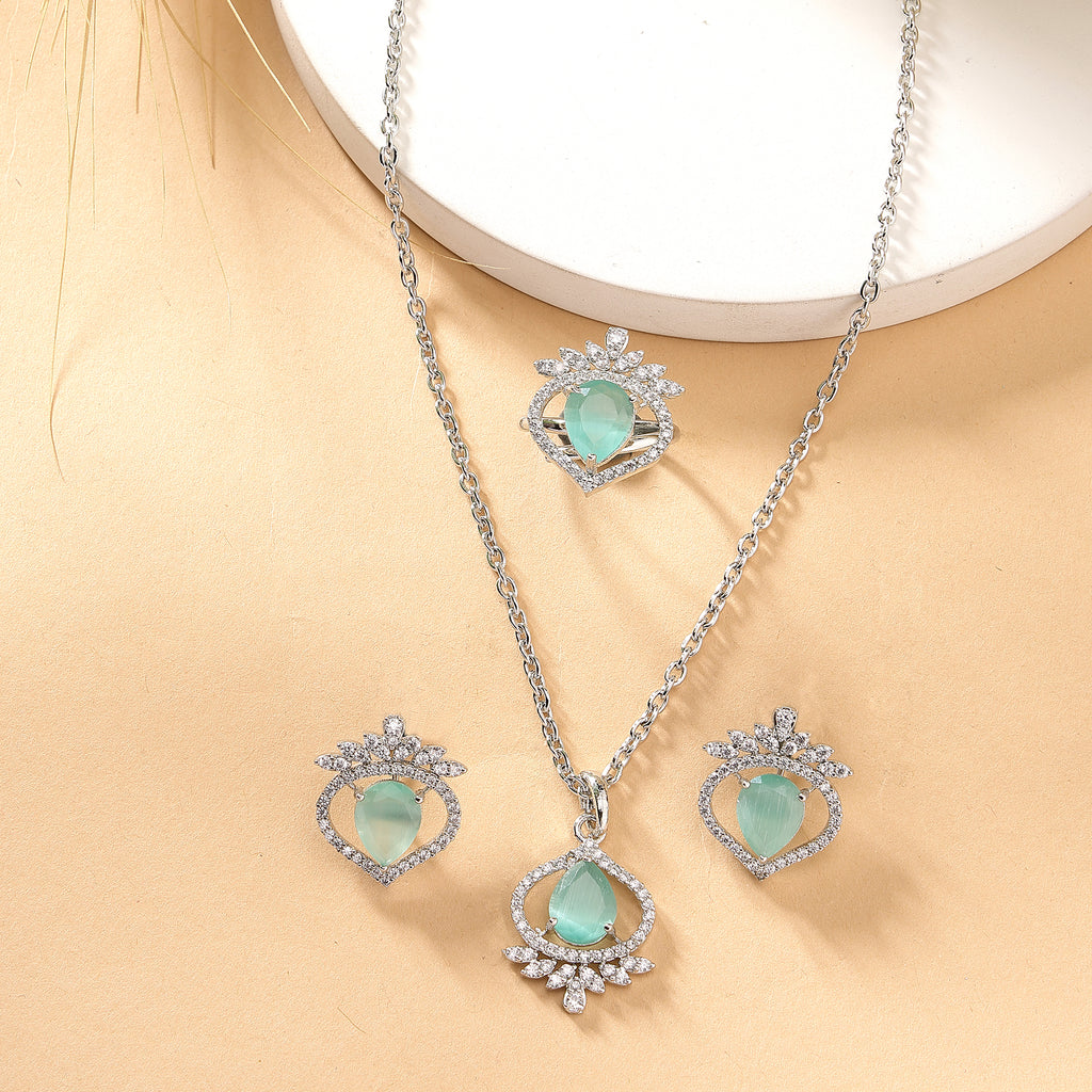 Elegant Tear Drop Motif: This rhodium-plated teardrop-shaped design with Sea Blue gemstone at its core, symbolizing elegance and royalty. Surrounding the gemstone is a halo of shimmering white stones, adding a touch of brilliance and sophistication
