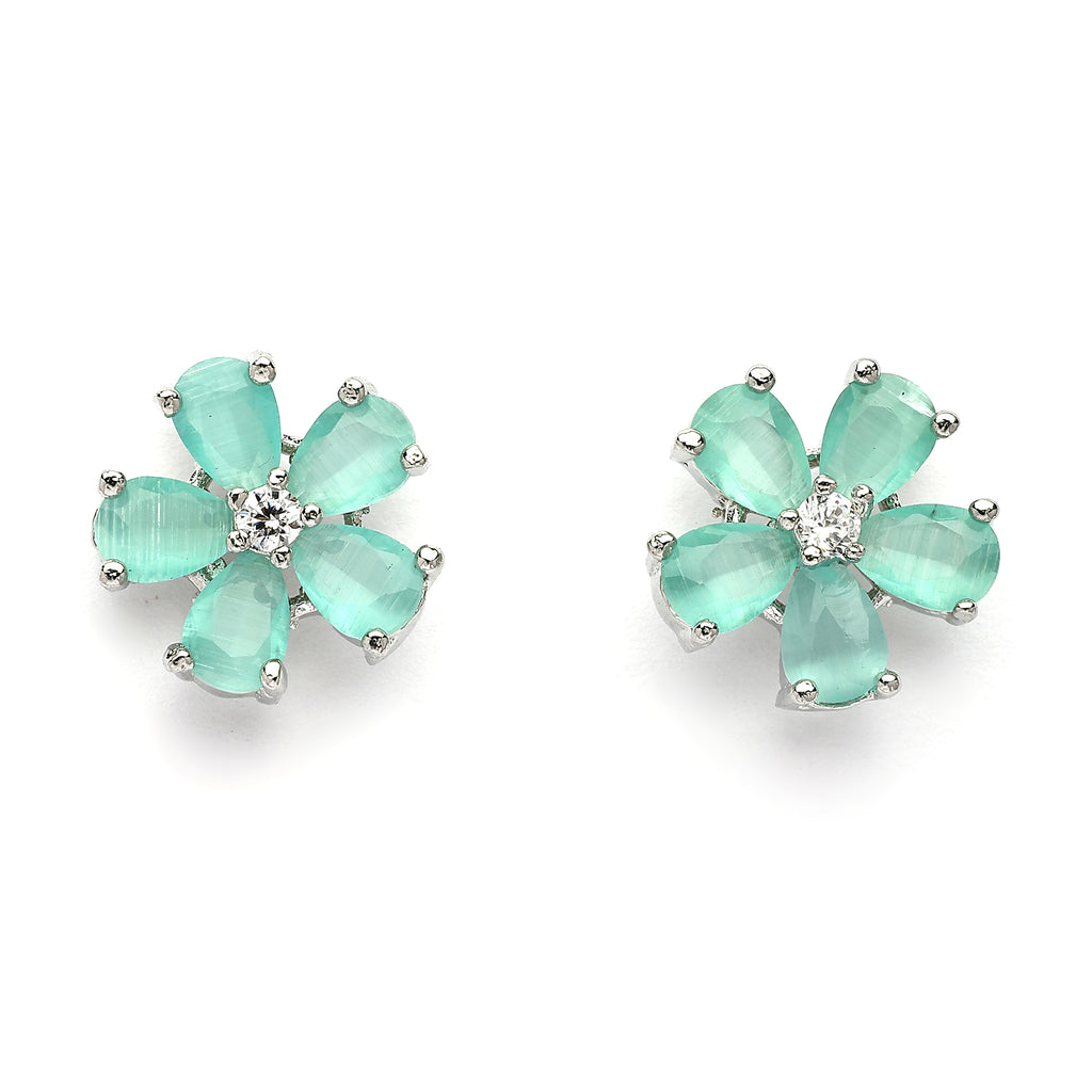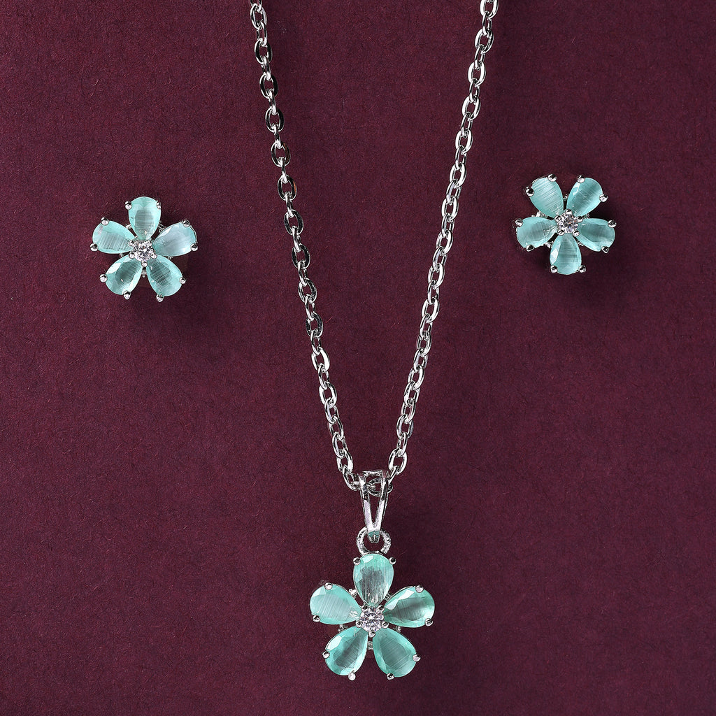 Elegant Design: This rhodium-plated silver toned American Diamond studded floral shaped Pendant set with a pair of matching earrings boasts a sophisticated Trendy design, exuding timeless elegance.
