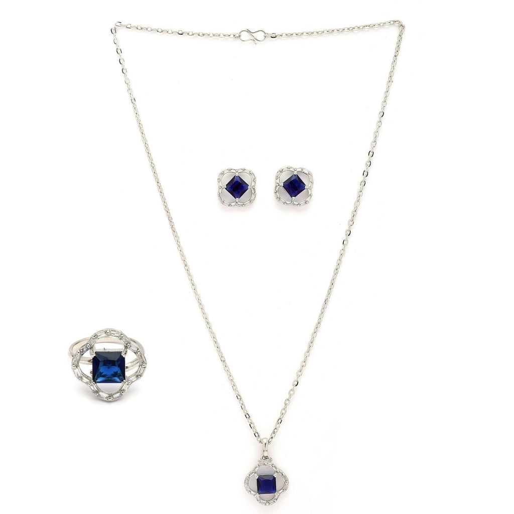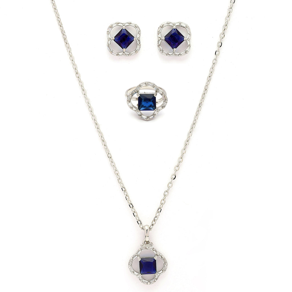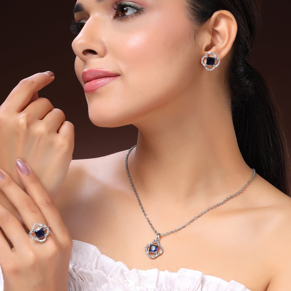 Elegant Design: This rhodium-plated silver toned American Diamond studded square shaped Pendant set with a pair of matching earrings & ring boasts a sophisticated Trendy design, exuding timeless elegance.