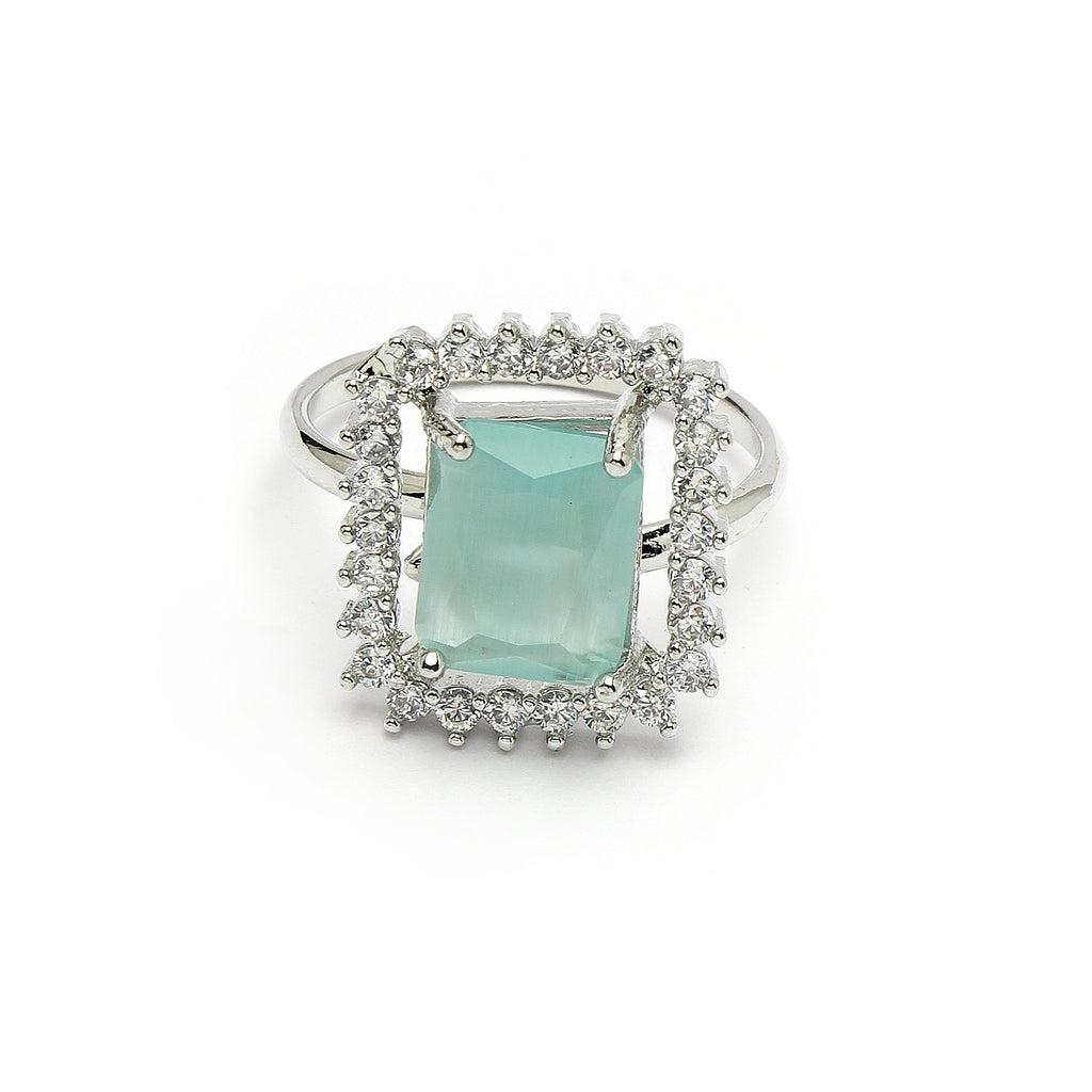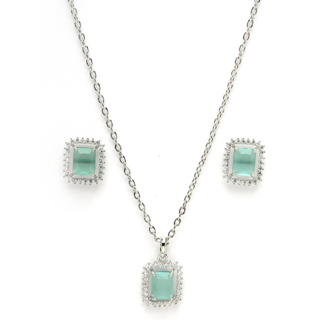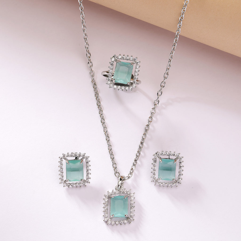 Rhodium Plated Silver Toned Square Shaped Sea Blue American Diamond Studded Pendant Combo With Ring