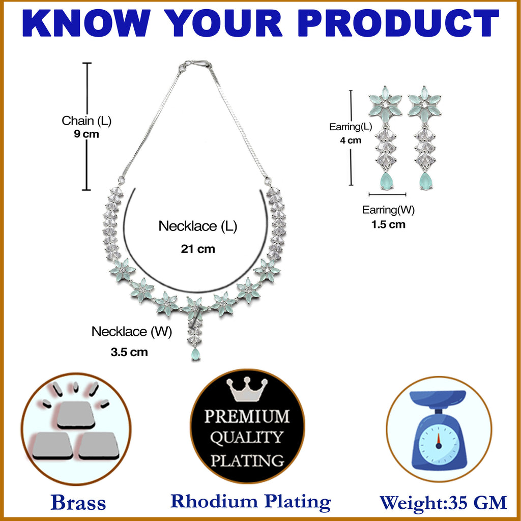 This jewellery set consists of a necklace and a pair of earrings. Rhodium-Plated green american diamond studded necklace, has secured with hook closure. A pair of matching drop earrings, each secured with a post and back closure.
