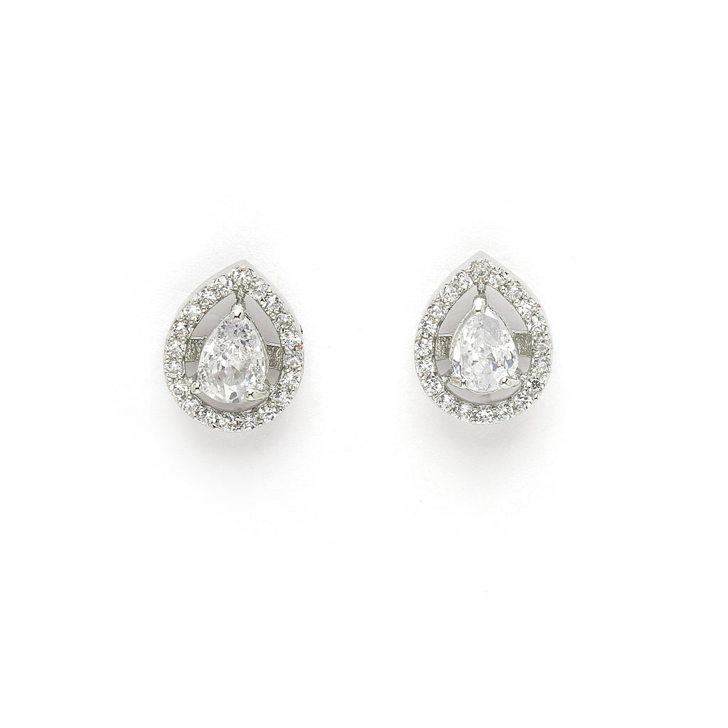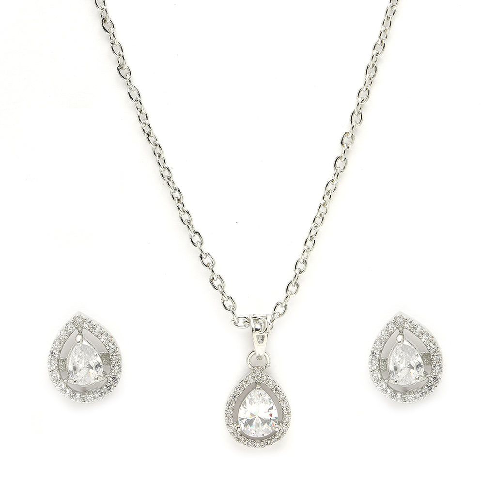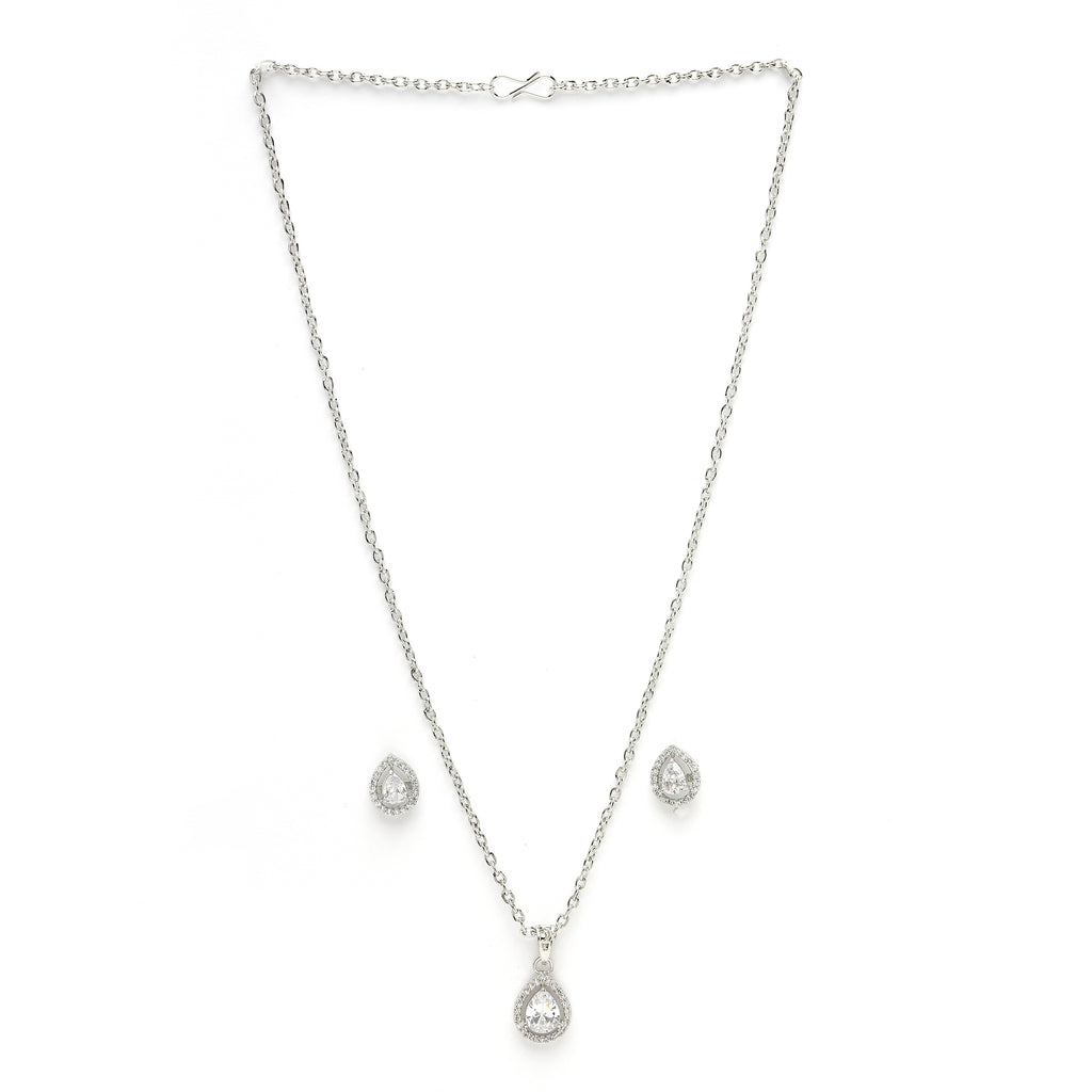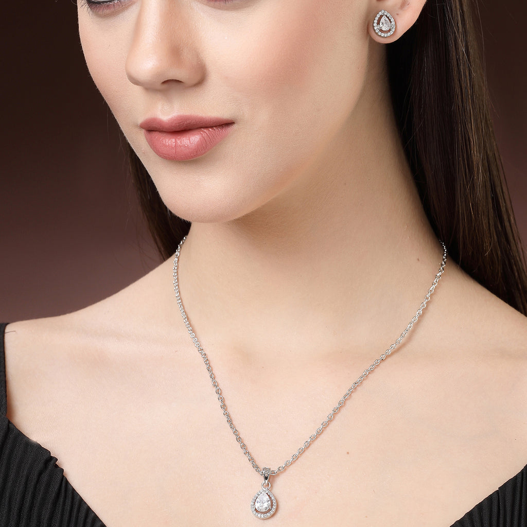 Tear Dropped Design: This Rhodium plated Tear Dropped Shaped Pendant set with White gemstone at its core for a harmonized and stylish look.