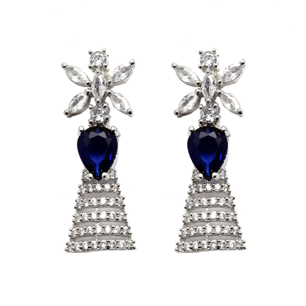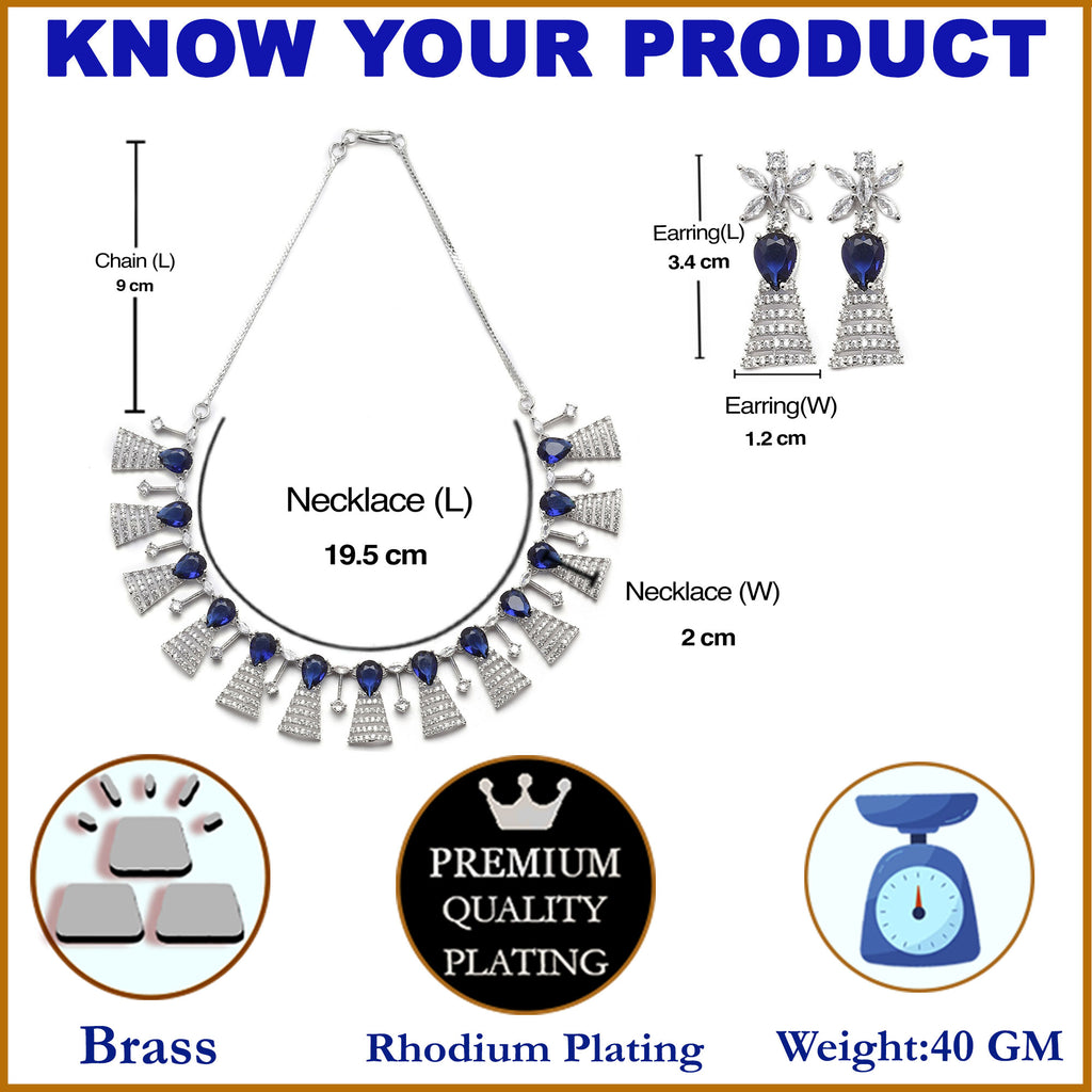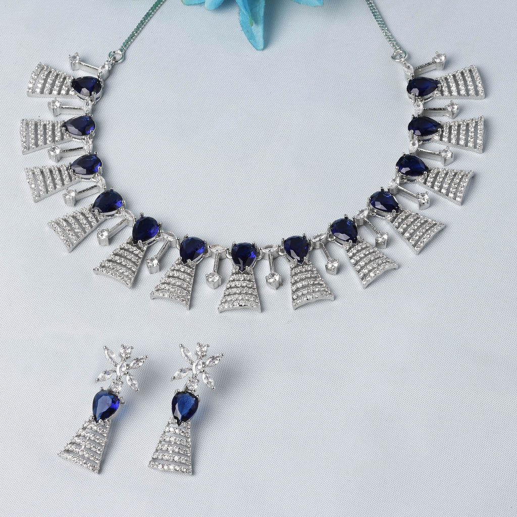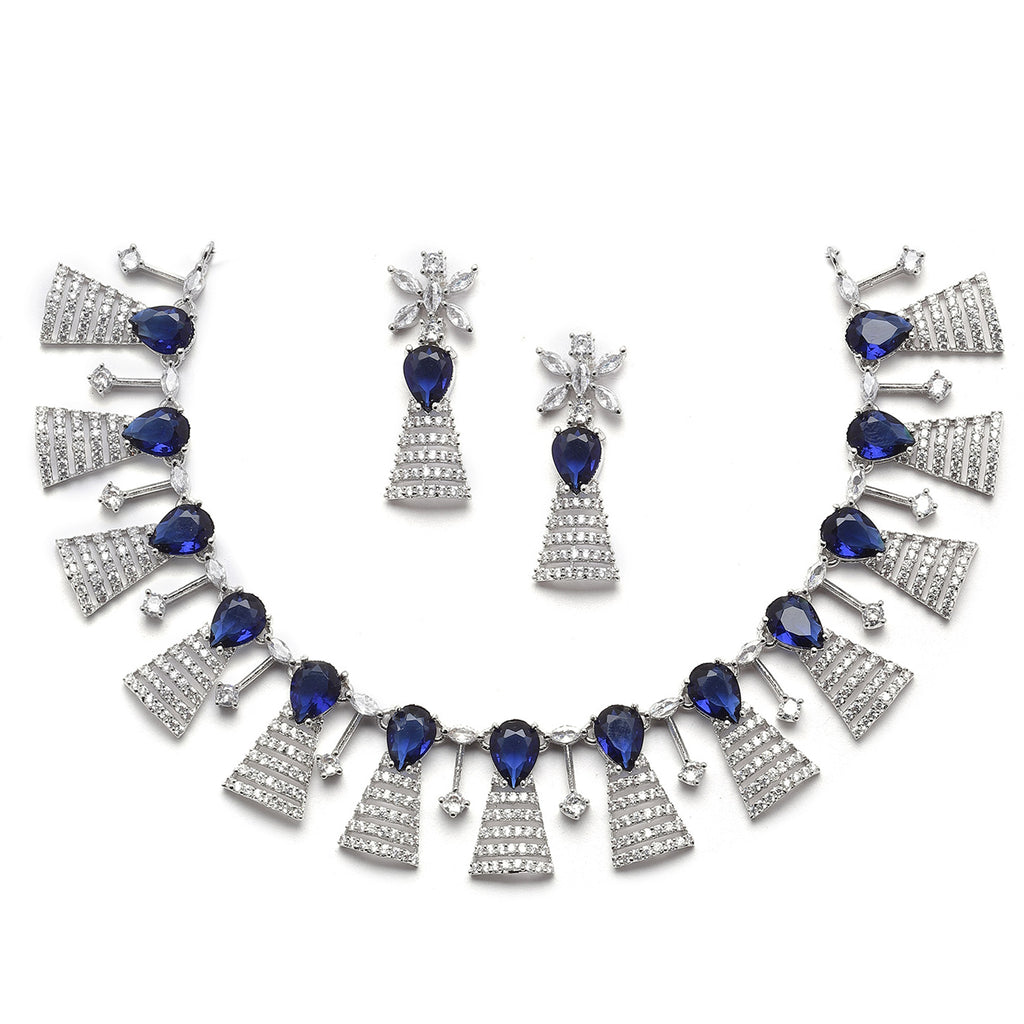Rhodium-Plated Silver Toned Teardrop Navy Blue American Diamond Studded Necklace Earrings Jewellery Set