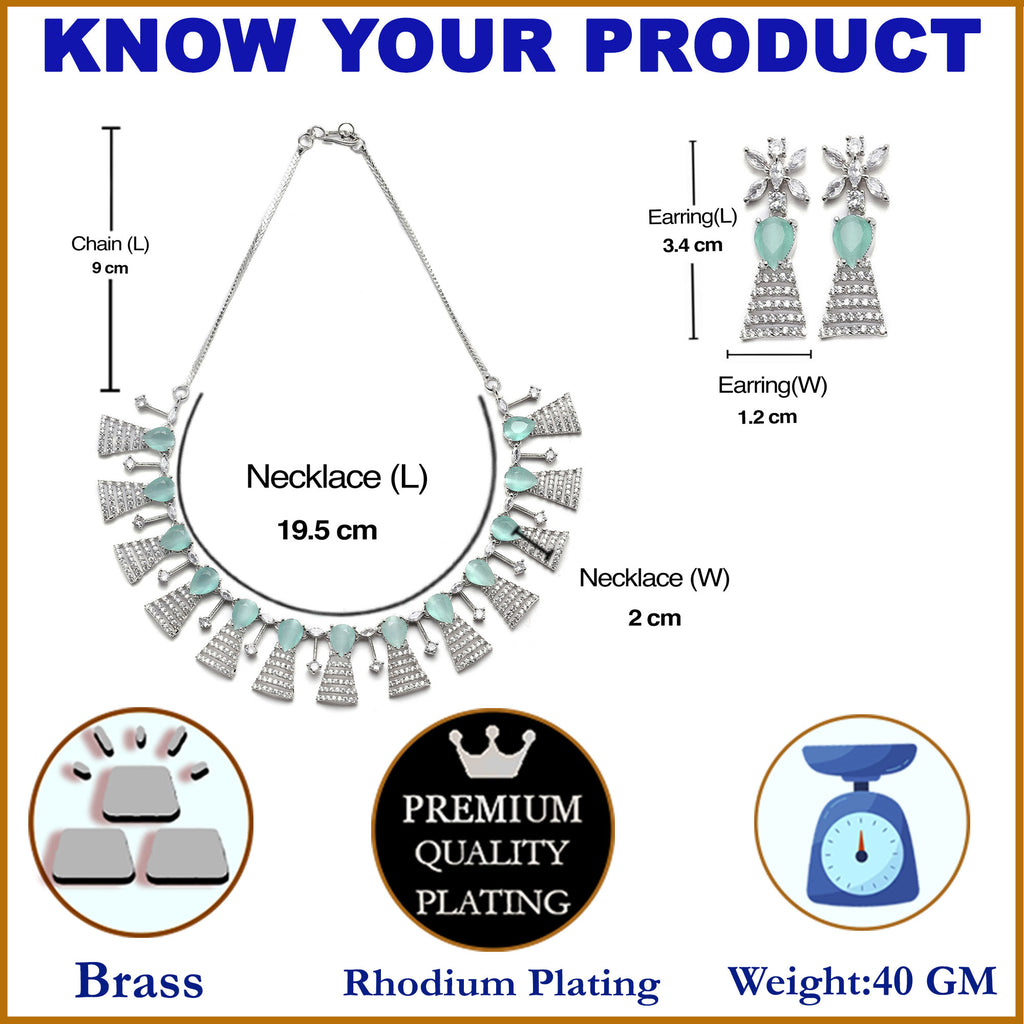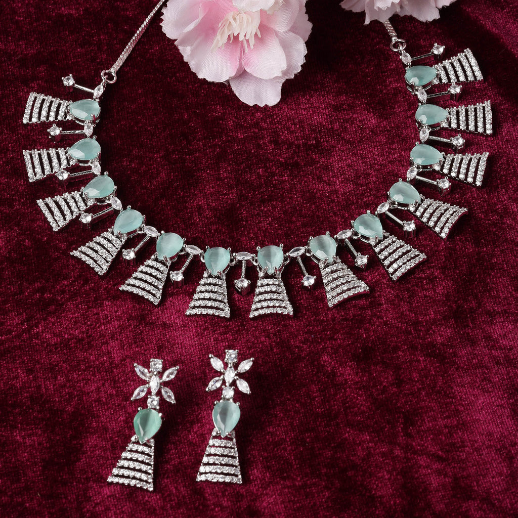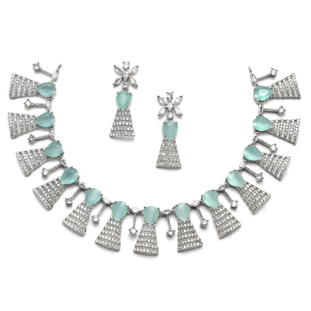 Rhodium-Plated Silver Toned Teardrop Sea Green American Diamond Studded Necklace Earrings Jewellery Set