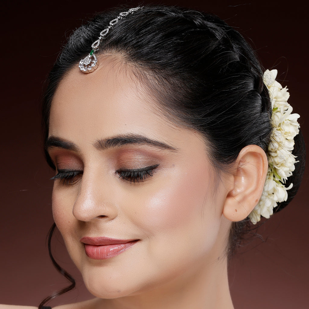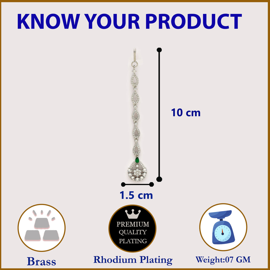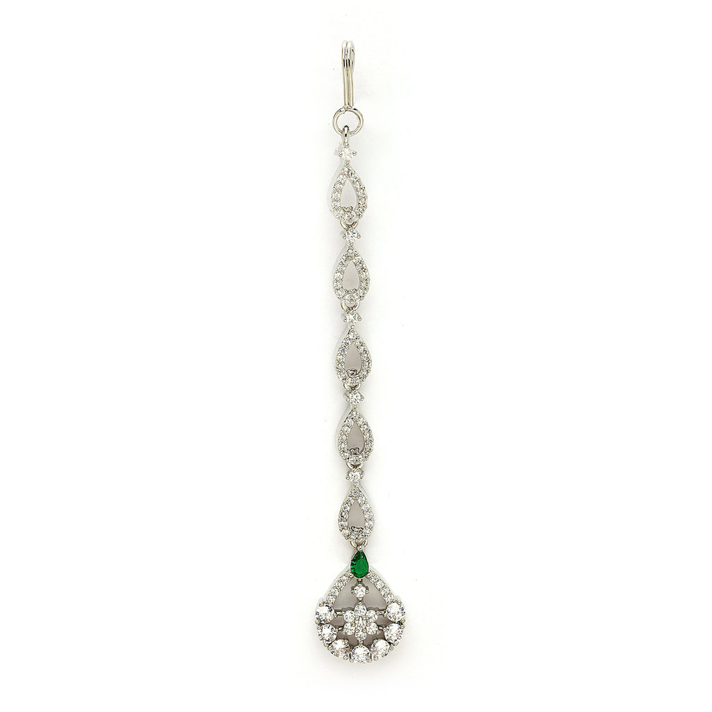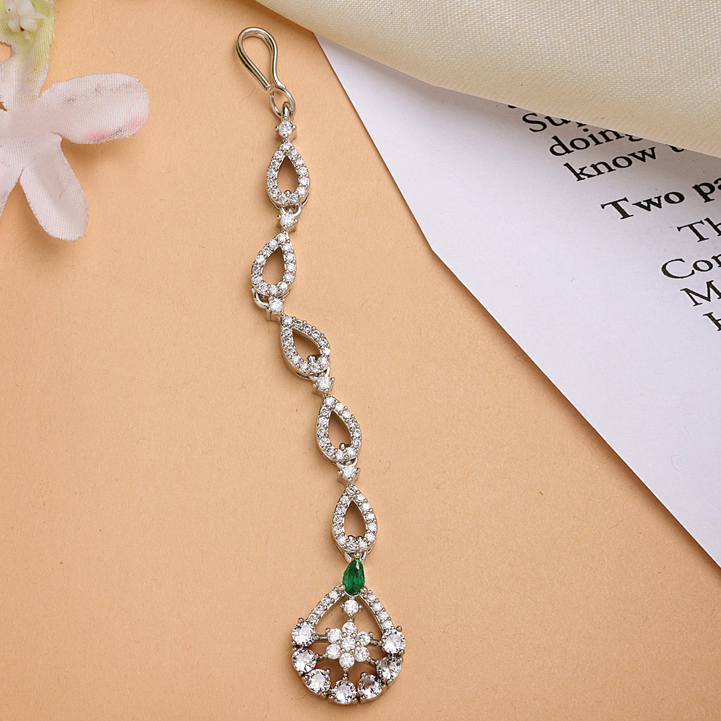 Rhodium Plated Silver Toned Teardrop Shaped Green American Diamond Studded Maang Tikka