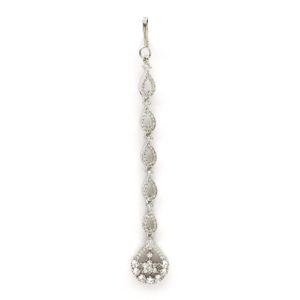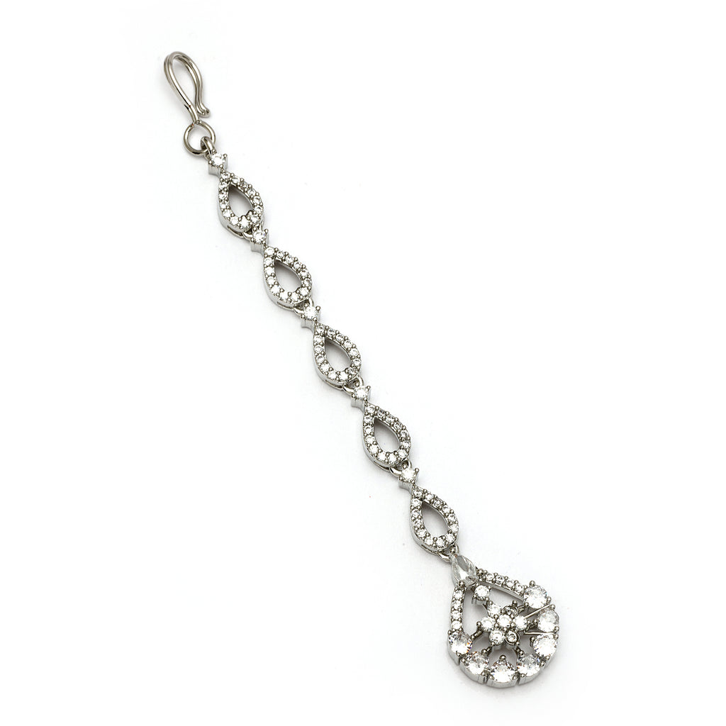 Rhodium Plated Silver Toned Teardrop Shaped White American Diamond Studded Maang Tikka