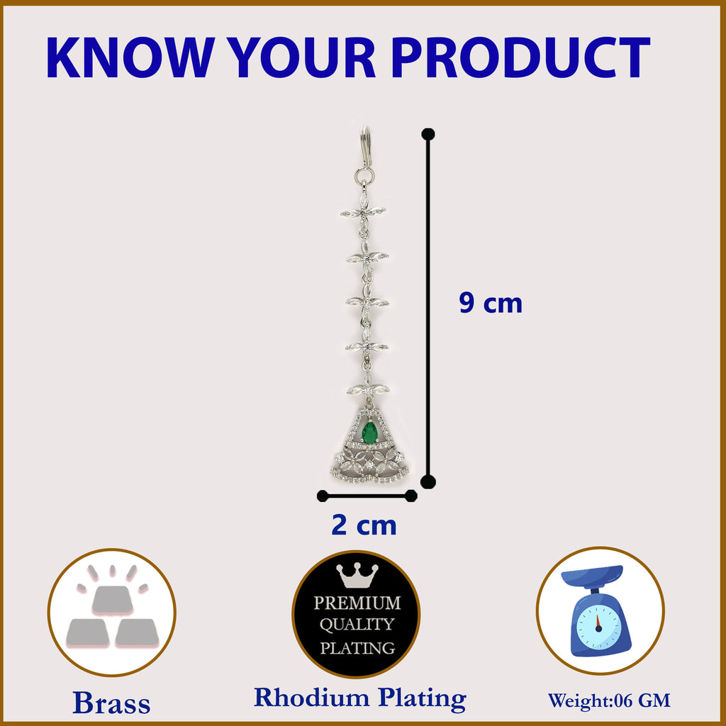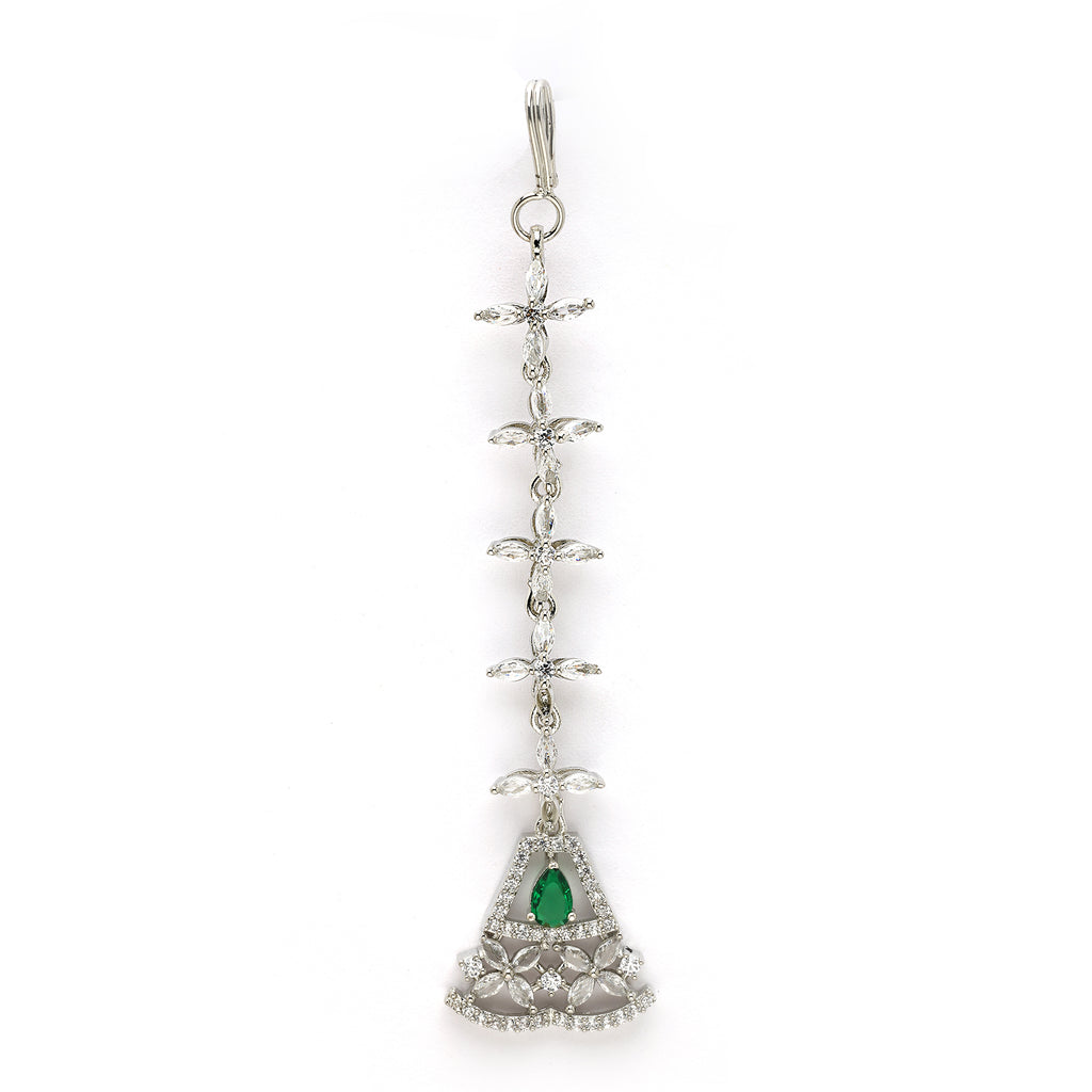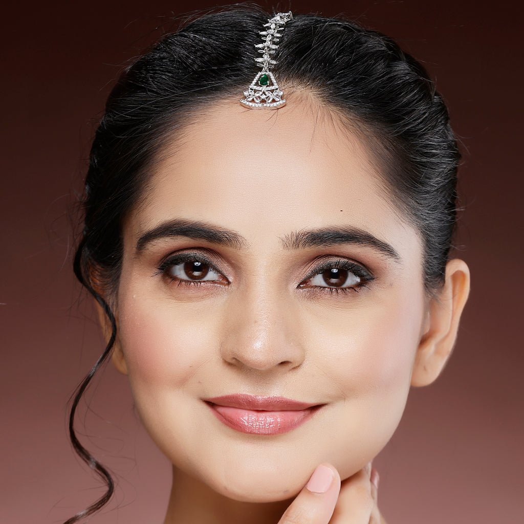 Elegant Design: This Maang Tikka features a delicate chain of marquise-shaped stones, leading to a beautiful triangular pendant with a green teardrop gemstone and floral detailing, making it an elegant accessory for any occasion.