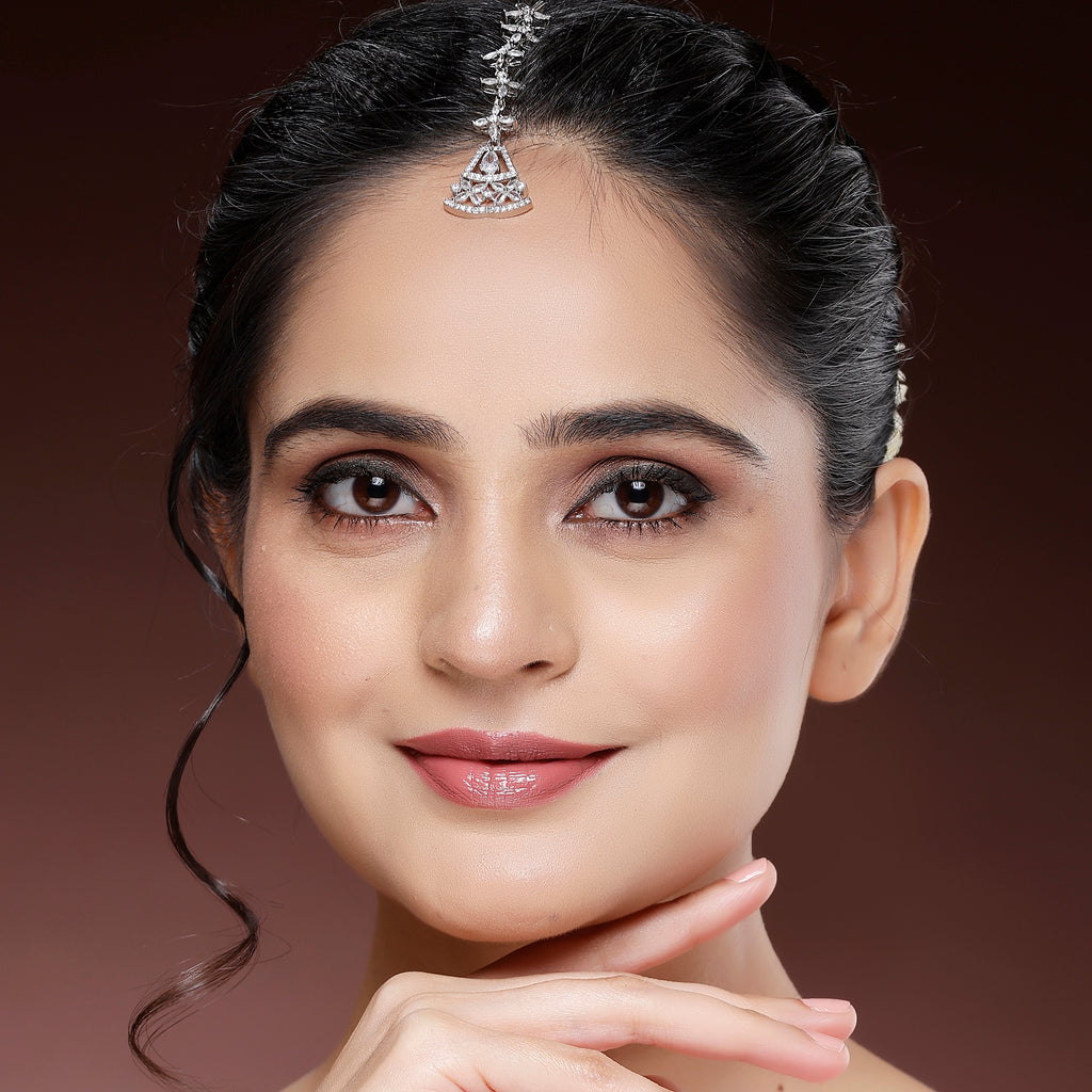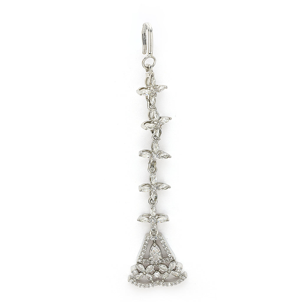 Elegant Design: This Maang Tikka features a delicate chain of marquise-shaped stones, leading to a beautiful triangular pendant with a white teardrop gemstone and floral detailing, making it an elegant accessory for any occasion.