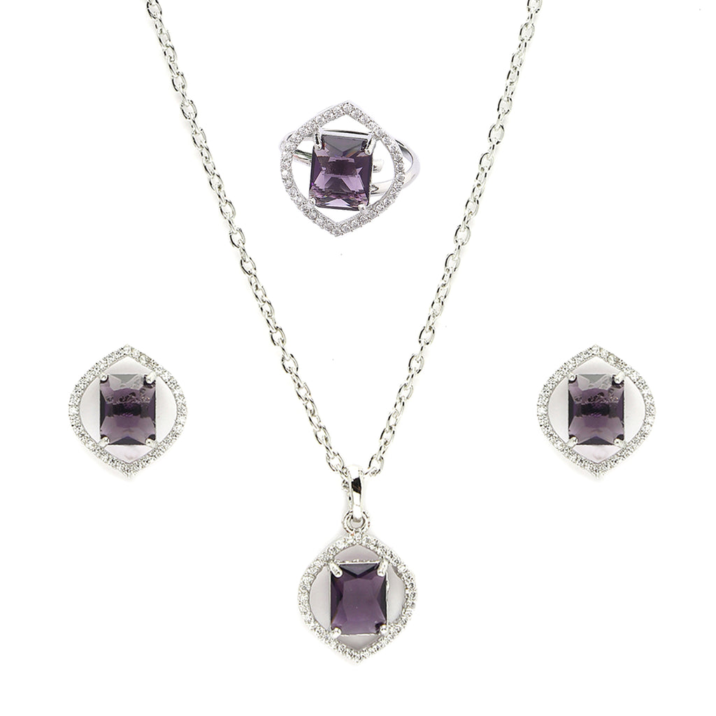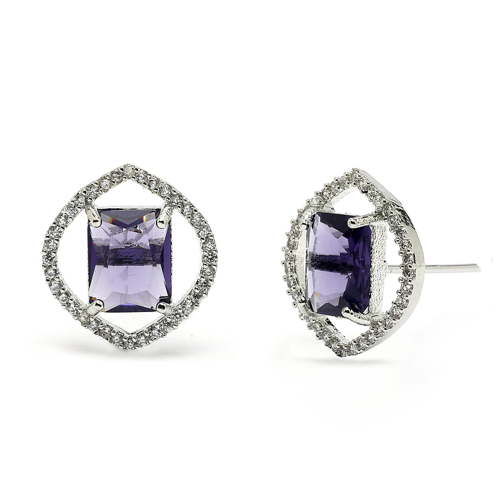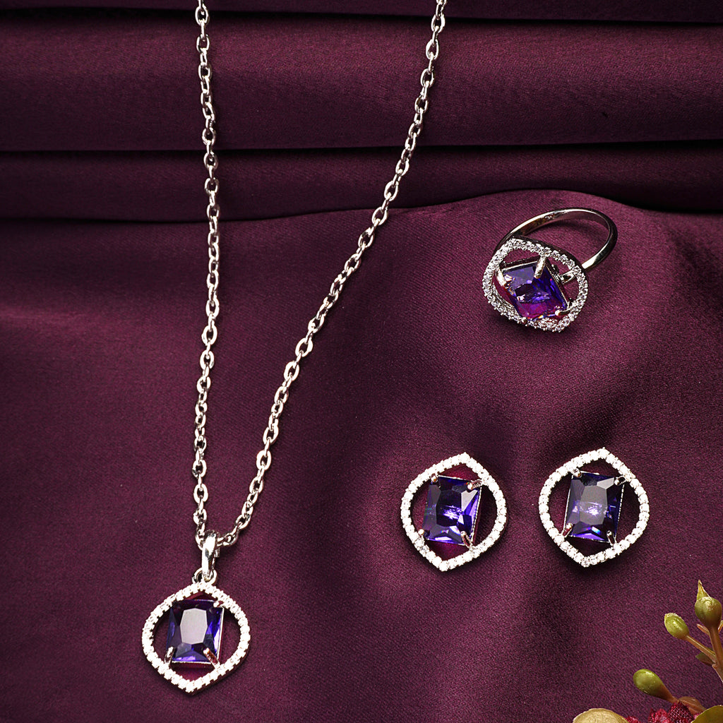 Elegant Design : This rhodium-plated with Purple gemstone at its core for a harmonized and stylish look. Surrounding the gemstone is a halo of shimmering white stones, adding a touch of brilliance and sophistication