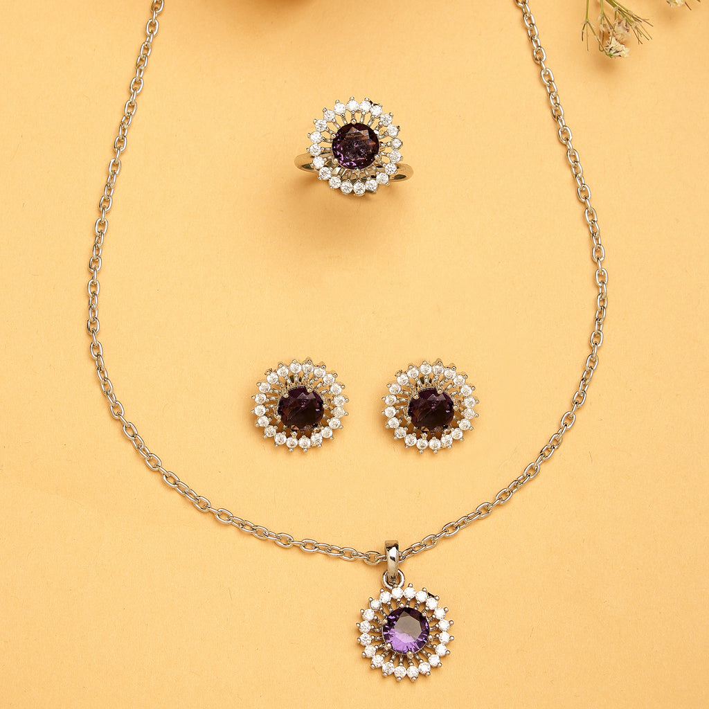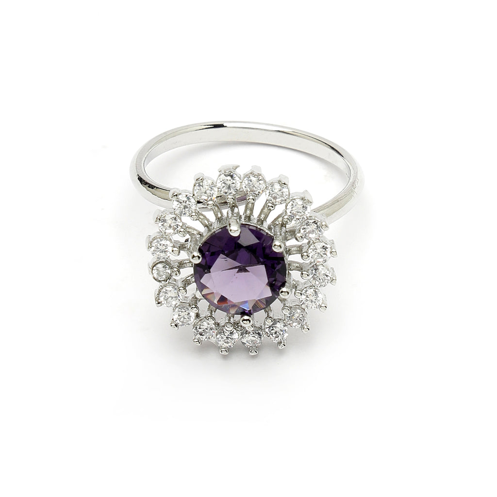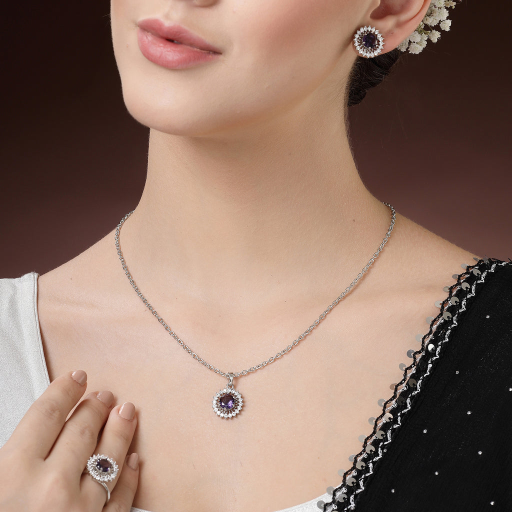 Elegant Design : This rhodium-plated with Violet gemstone at its core for a harmonized and stylish look. Surrounding the gemstone is a halo of shimmering white stones, adding a touch of brilliance and sophistication