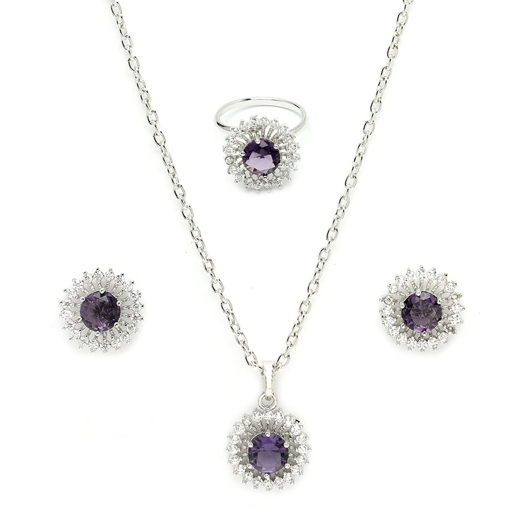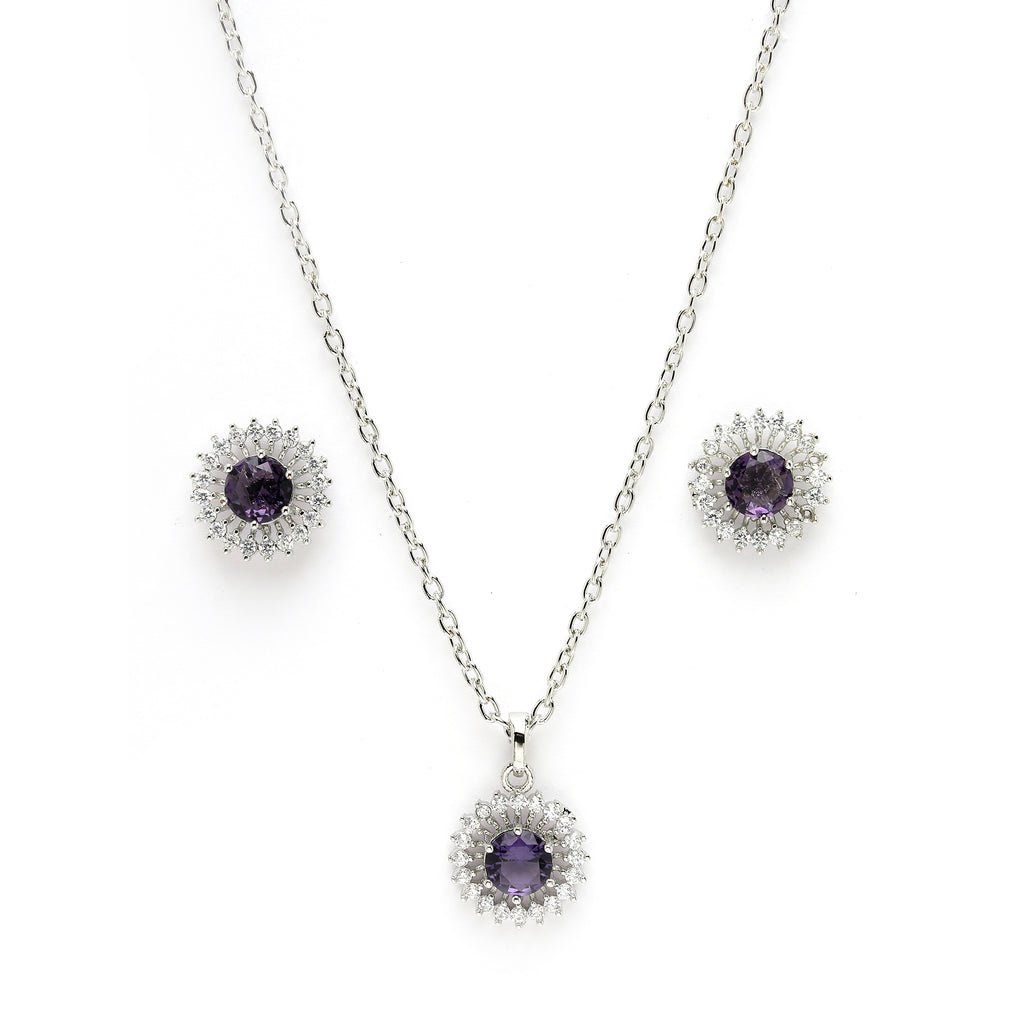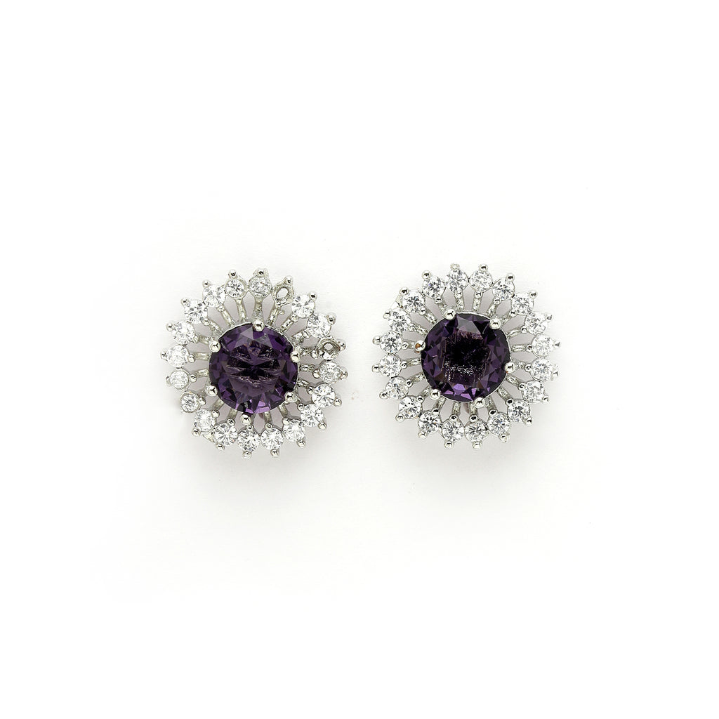 Elegant Design : This rhodium-plated with Violet gemstone at its core for a harmonized and stylish look. Surrounding the gemstone is a halo of shimmering white stones, adding a touch of brilliance and sophistication