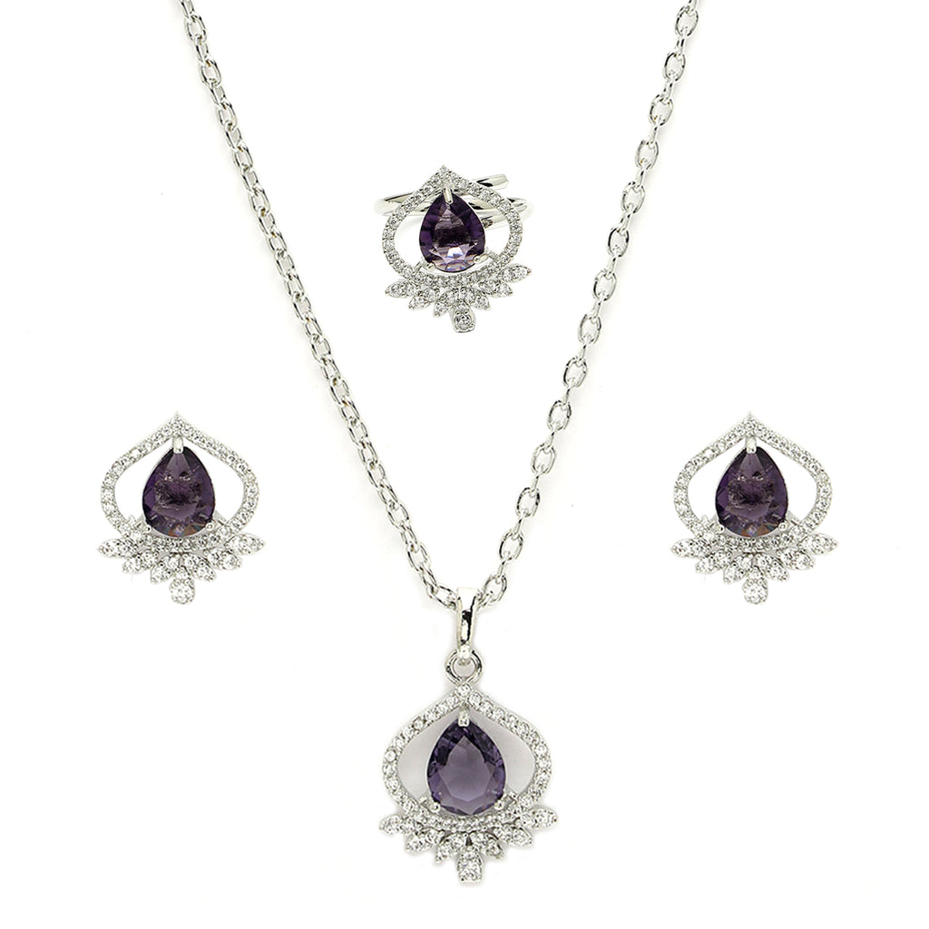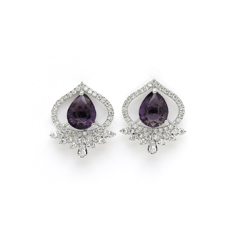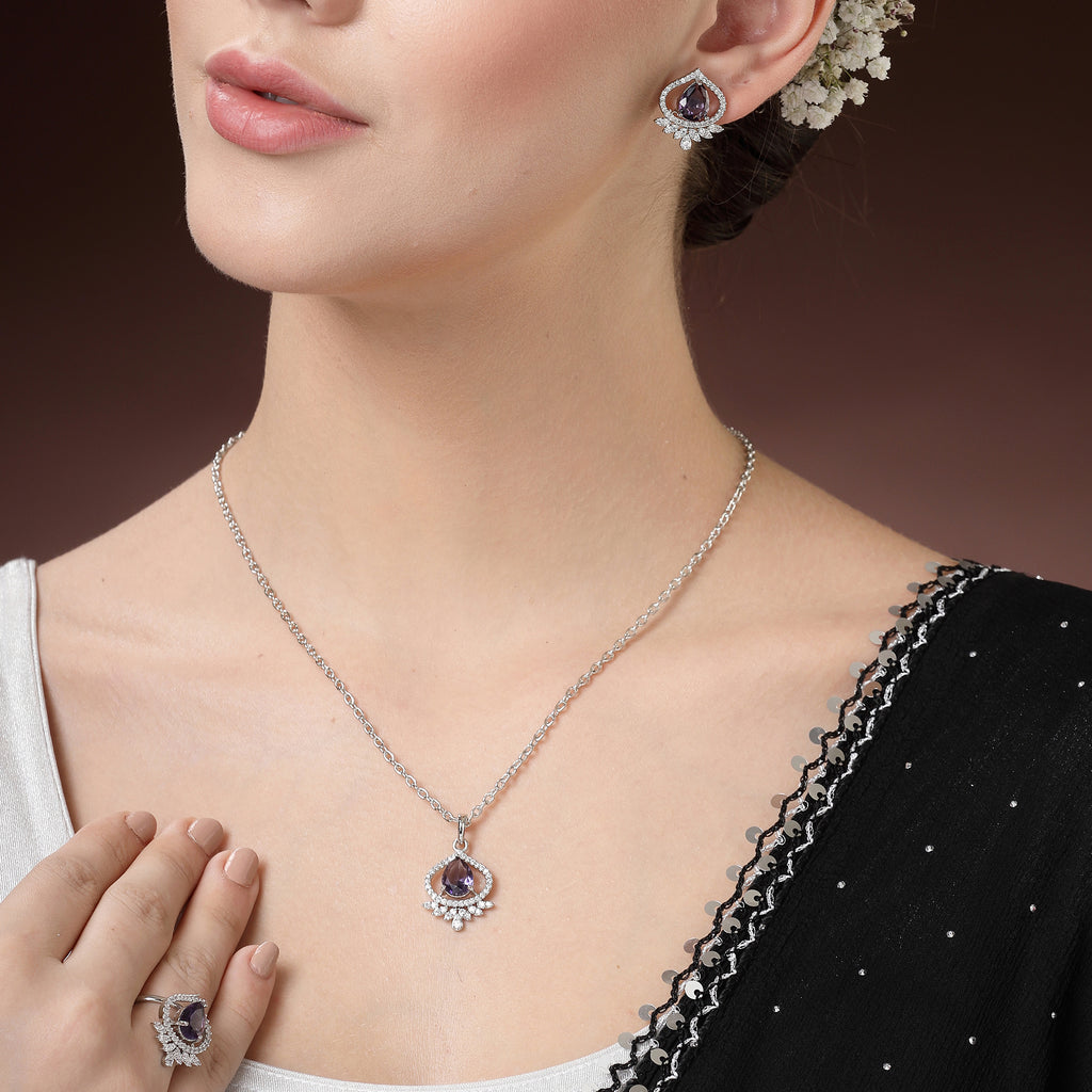 Elegant Tear Drop Motif: This rhodium-plated teardrop-shaped design with a deep purple gemstone at its core, symbolizing elegance and royalty. Surrounding the gemstone is a halo of shimmering white stones, adding a touch of brilliance and sophistication