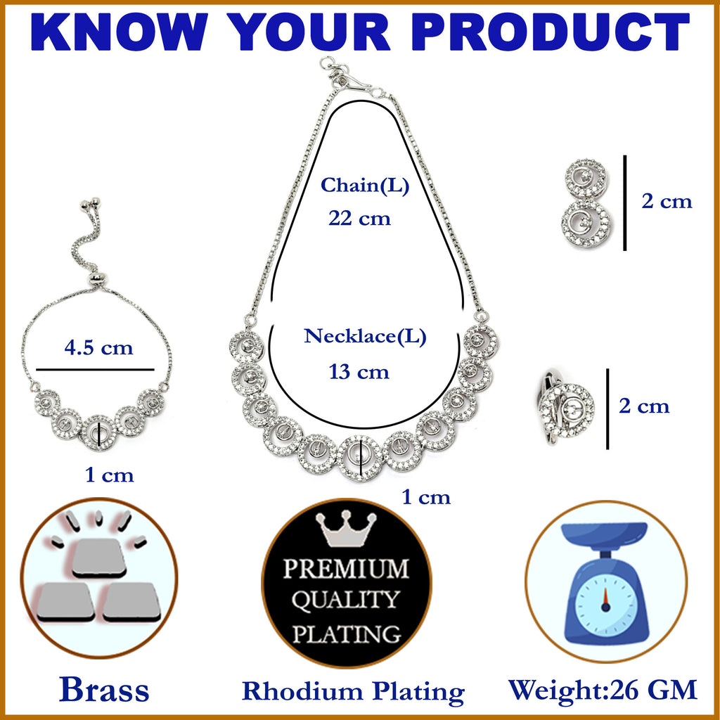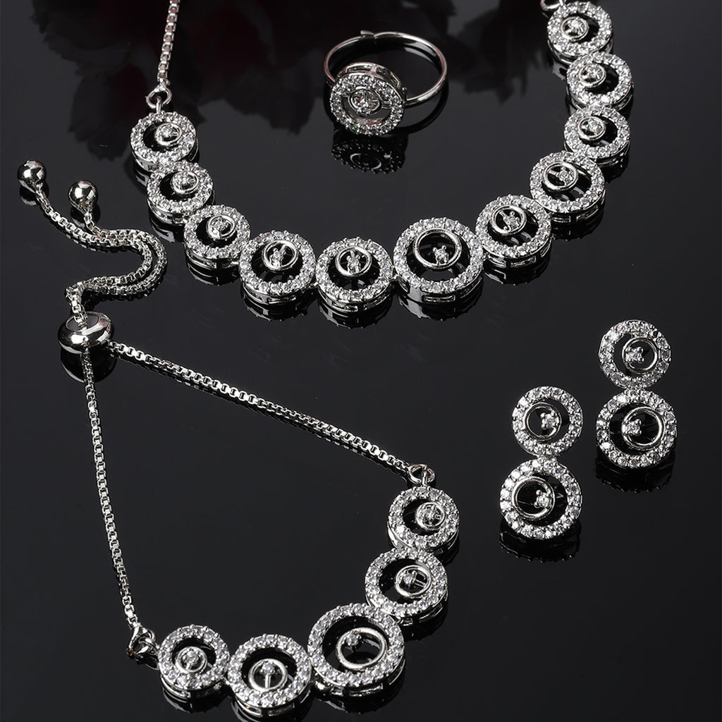This jewellery set consists of a necklace, a pair of earrings, a ring and a bracelet. Rhodium-Plated white american diamond studded circular shape necklace, has secured with s-hook closure. A pair of matching drop earrings, each secured with a post and back closure. A mataching ring, secured with adjustable closure. A matching bracelet, secured with adjustable drawstring closure.