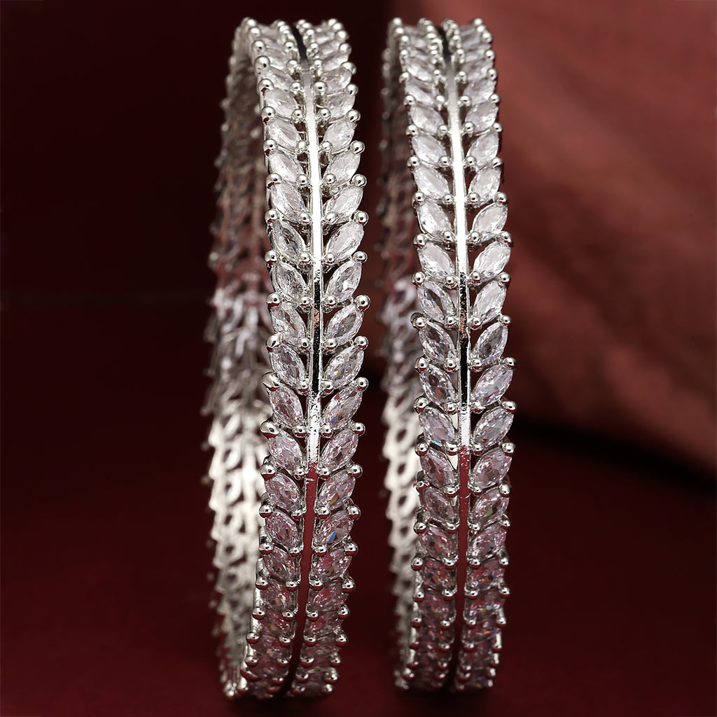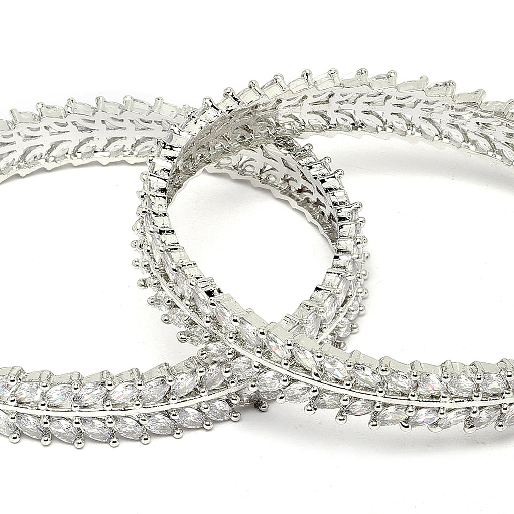 Rhodium-Plated Silver Toned White American Diamond studded Lead Shape Bangle Jewelry Set (Set Of 2)