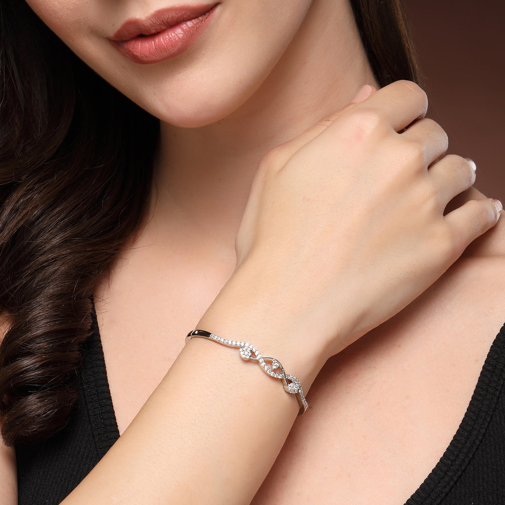 Elegant Design: This rhodium-plated Cuff bracelet showcases sparkling white Cubic Zirconia studded, adding a touch of sophistication to your look.