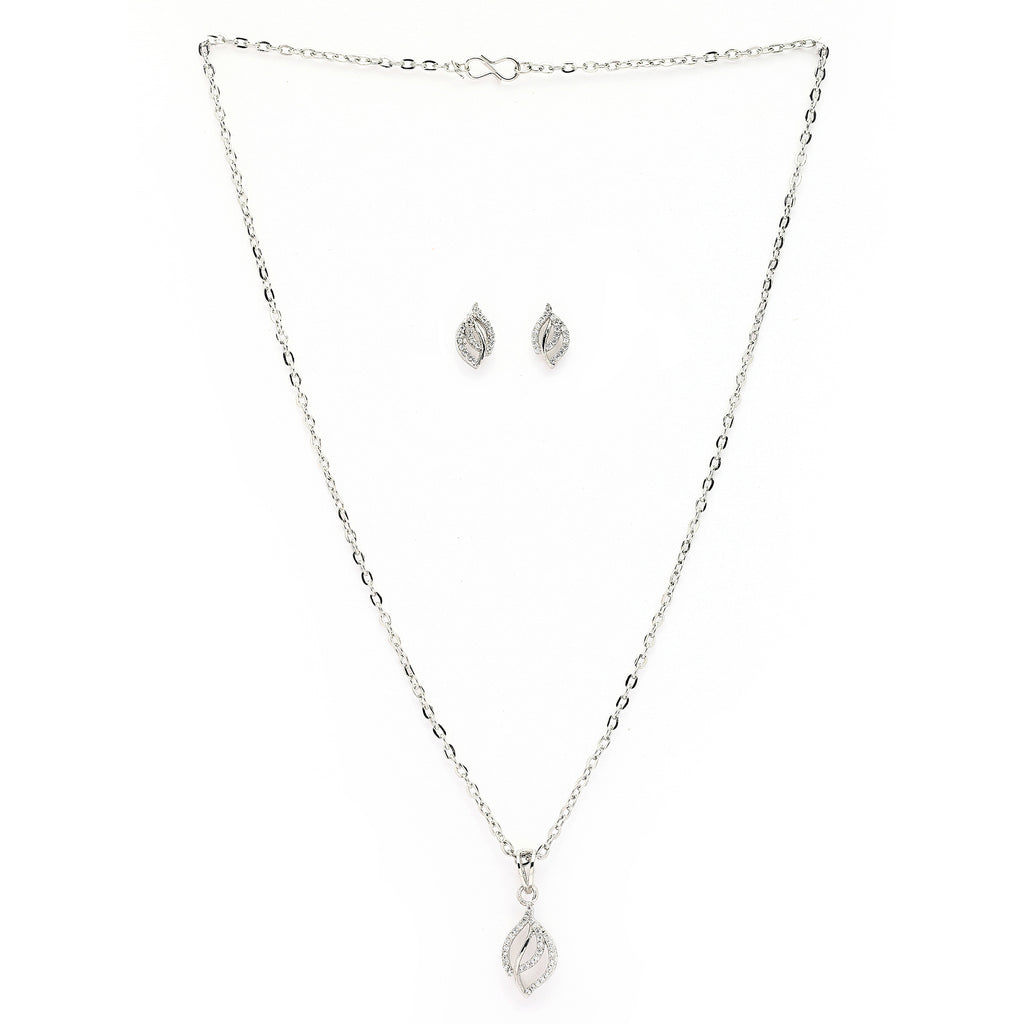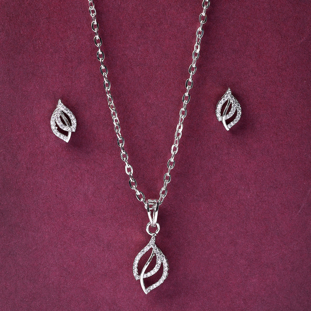 Elegant Design: This rhodium-plated silver toned Cubic Zirconia studded leaf shaped Pendant set with a pair of matching earrings boasts a sophisticated Trendy design, exuding timeless elegance.