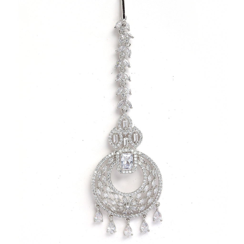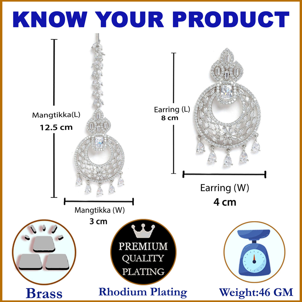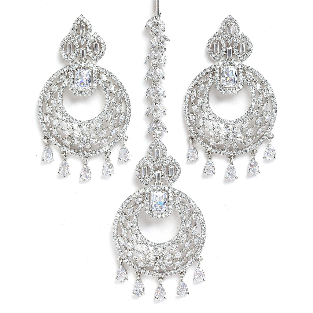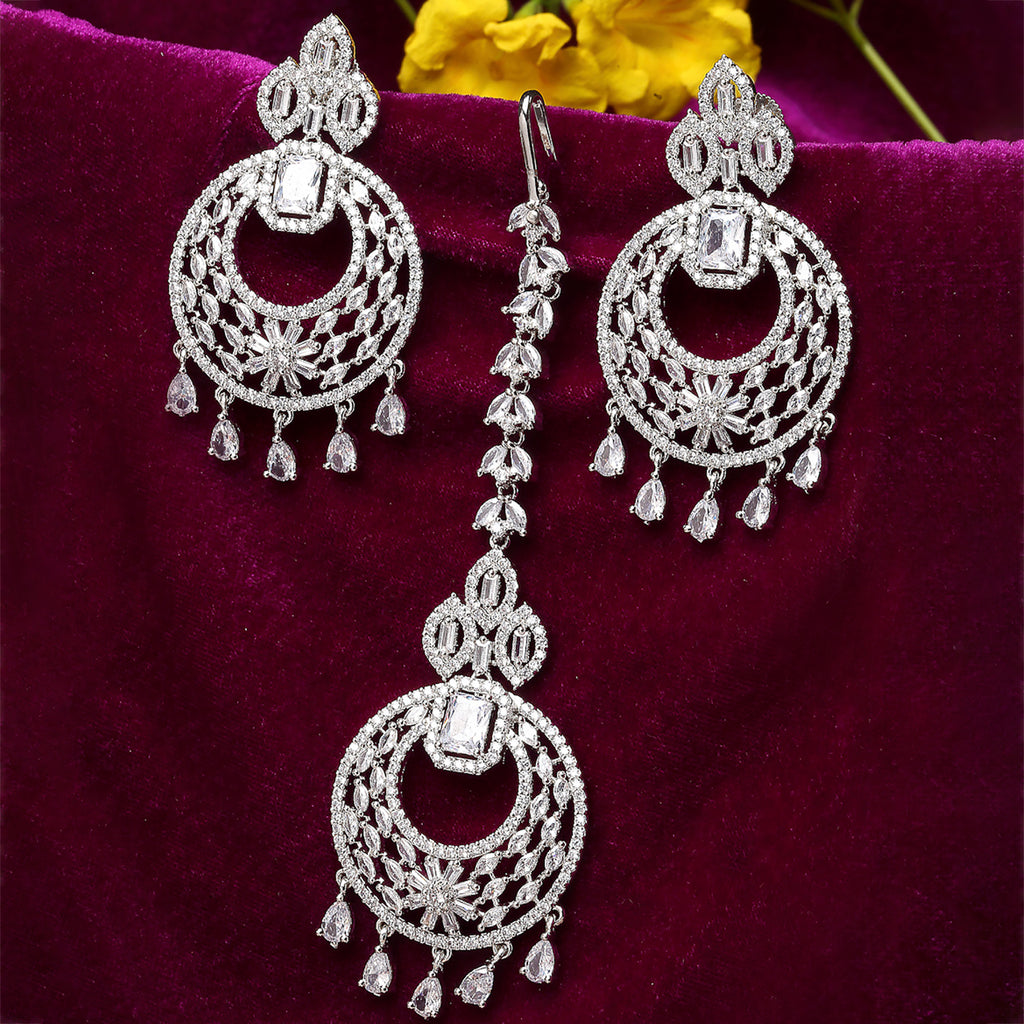 Rhodium-Plated Silver-Toned White Round American Diamond Studded Maang Tikka & Earrings Set