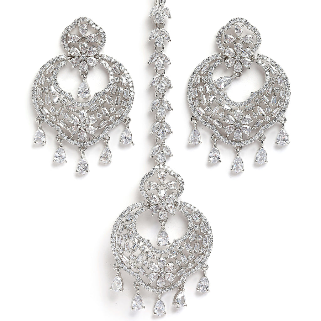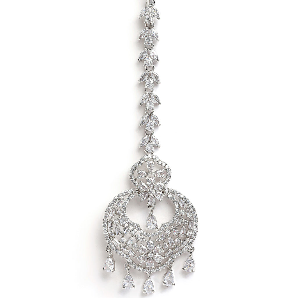 Rhodium-Plated Silver-Toned White Round American Diamond Studded Maang Tikka & Earrings Set