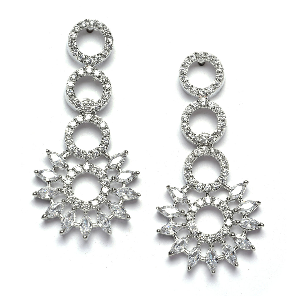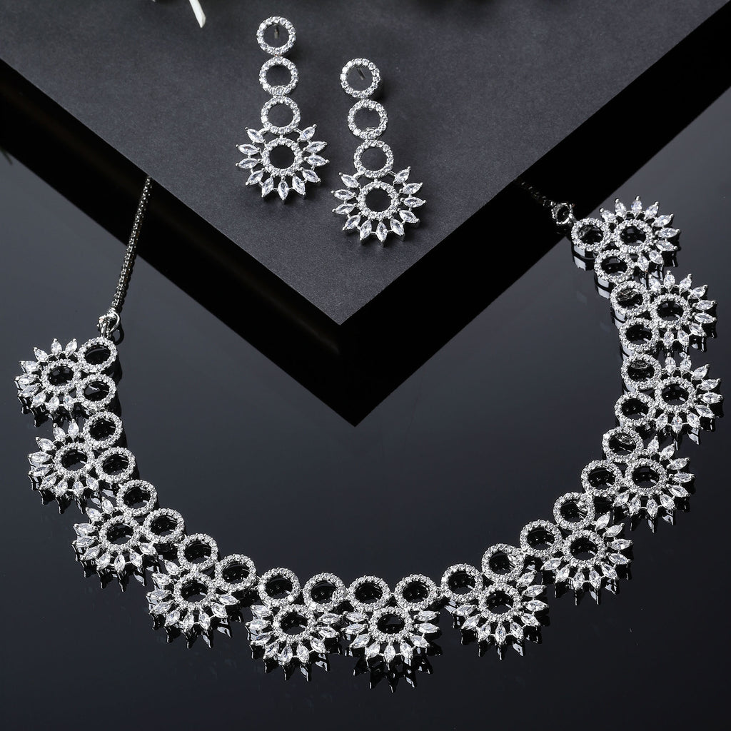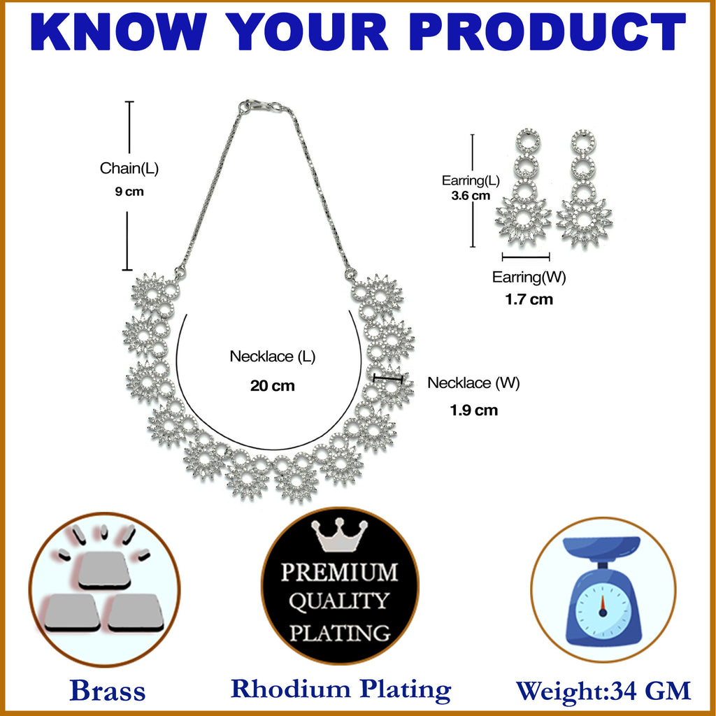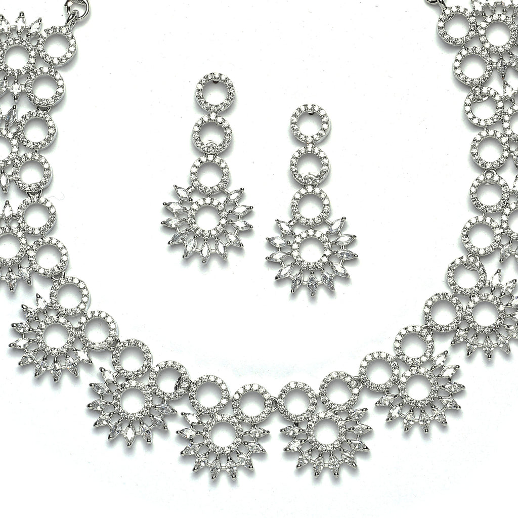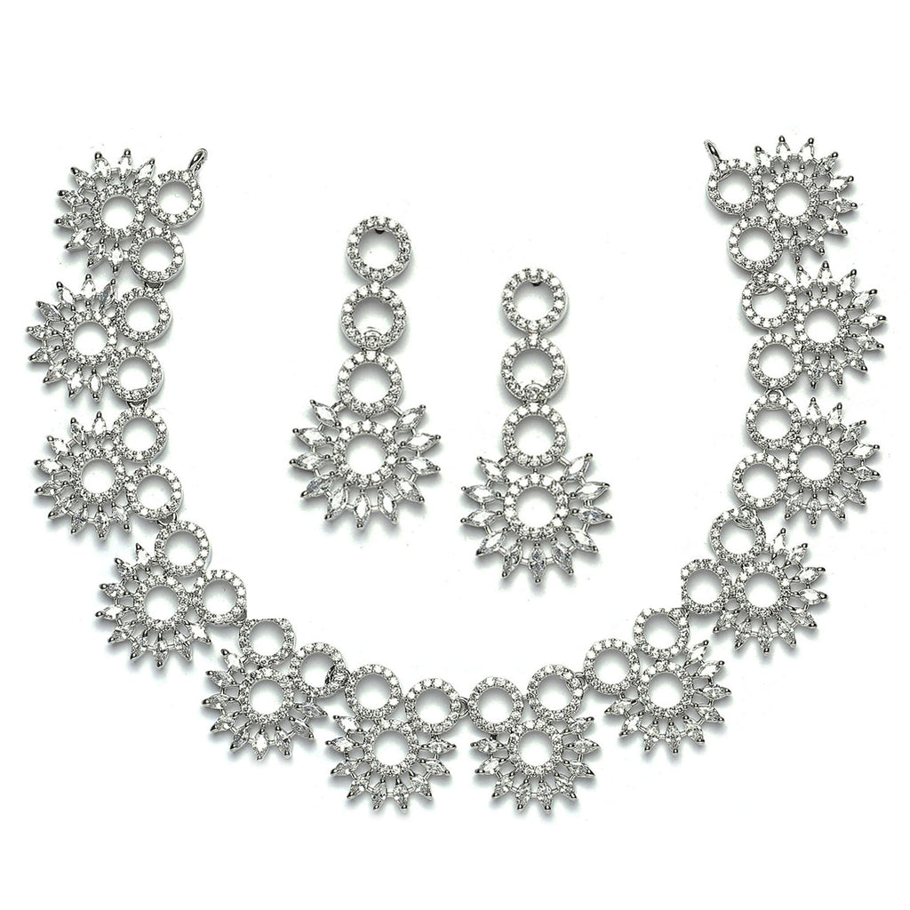 Rhodium-Plated White American Diamond Studded Classic Necklace with Earrings Jewellery Set