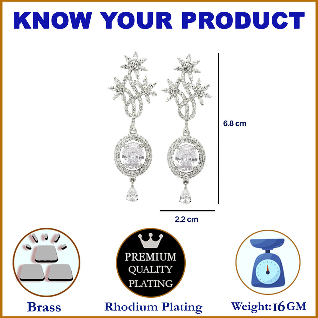 Rhodium-Plated with Silver-Toned White Contemporary Drop Earrings, has American Diamond studded secured with a post and back.