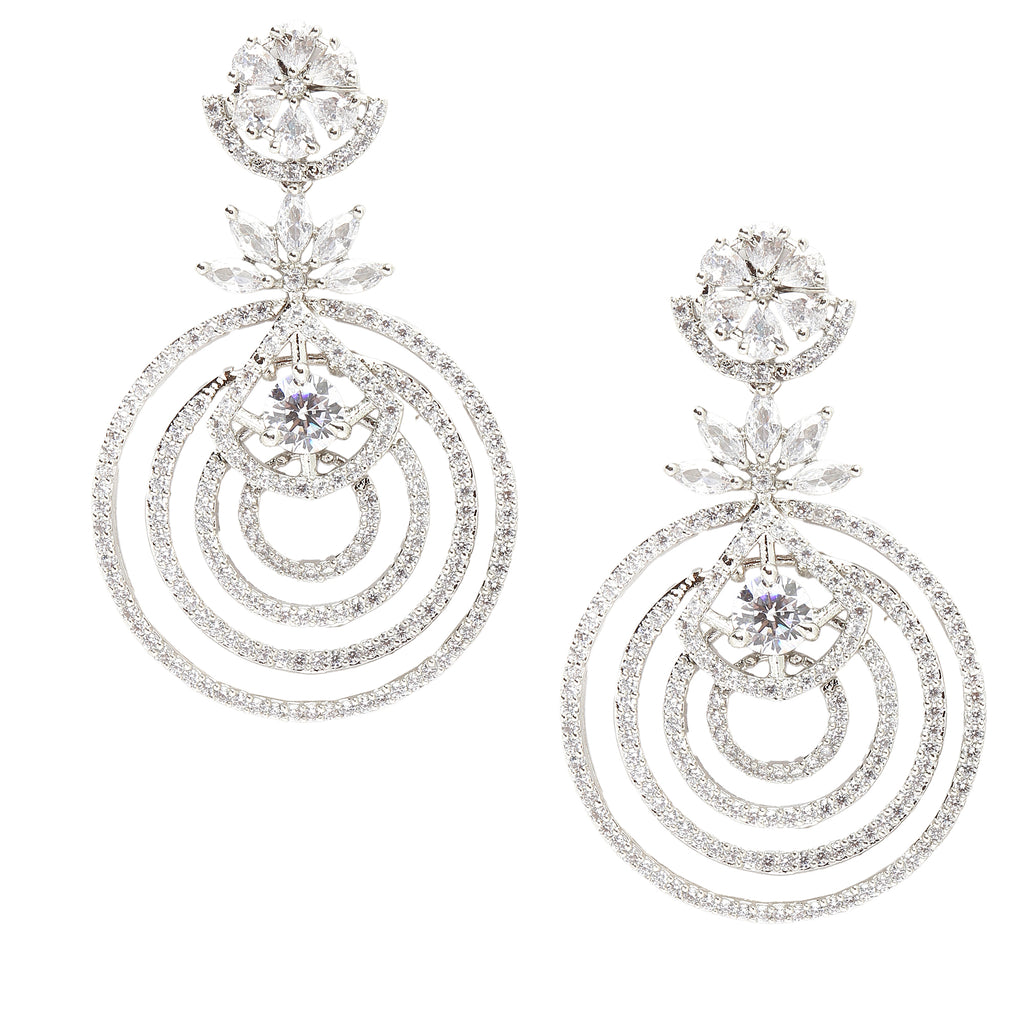 Rhodium-Plated White American Diamond studded Floral & Circular Layered Drop Earrings