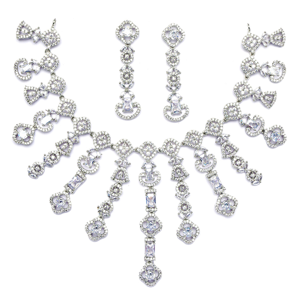 Rhodium-Plated White American Diamond Studded Floral Tasselled Necklace & Earrings Jewellery Set