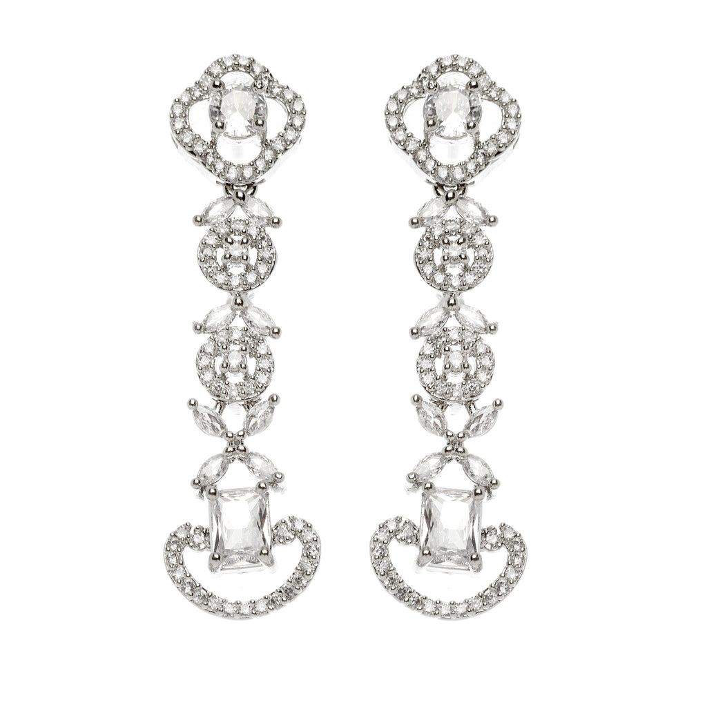 This jewellery set consists of a necklace and a pair of earrings. Rhodium-Plated white american diamond studded floral tasselled necklace, secured with hook closure. A pair of matching drop earrings, each secured with a post and back closure.
