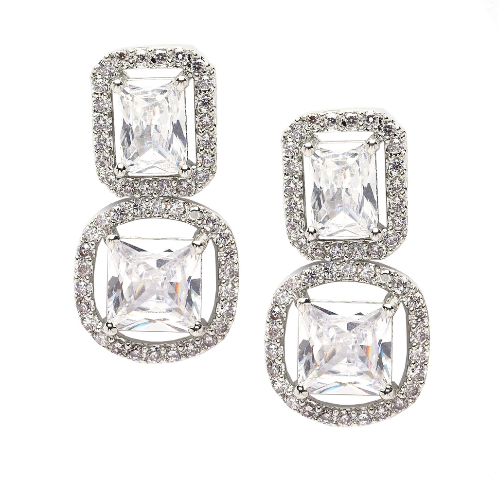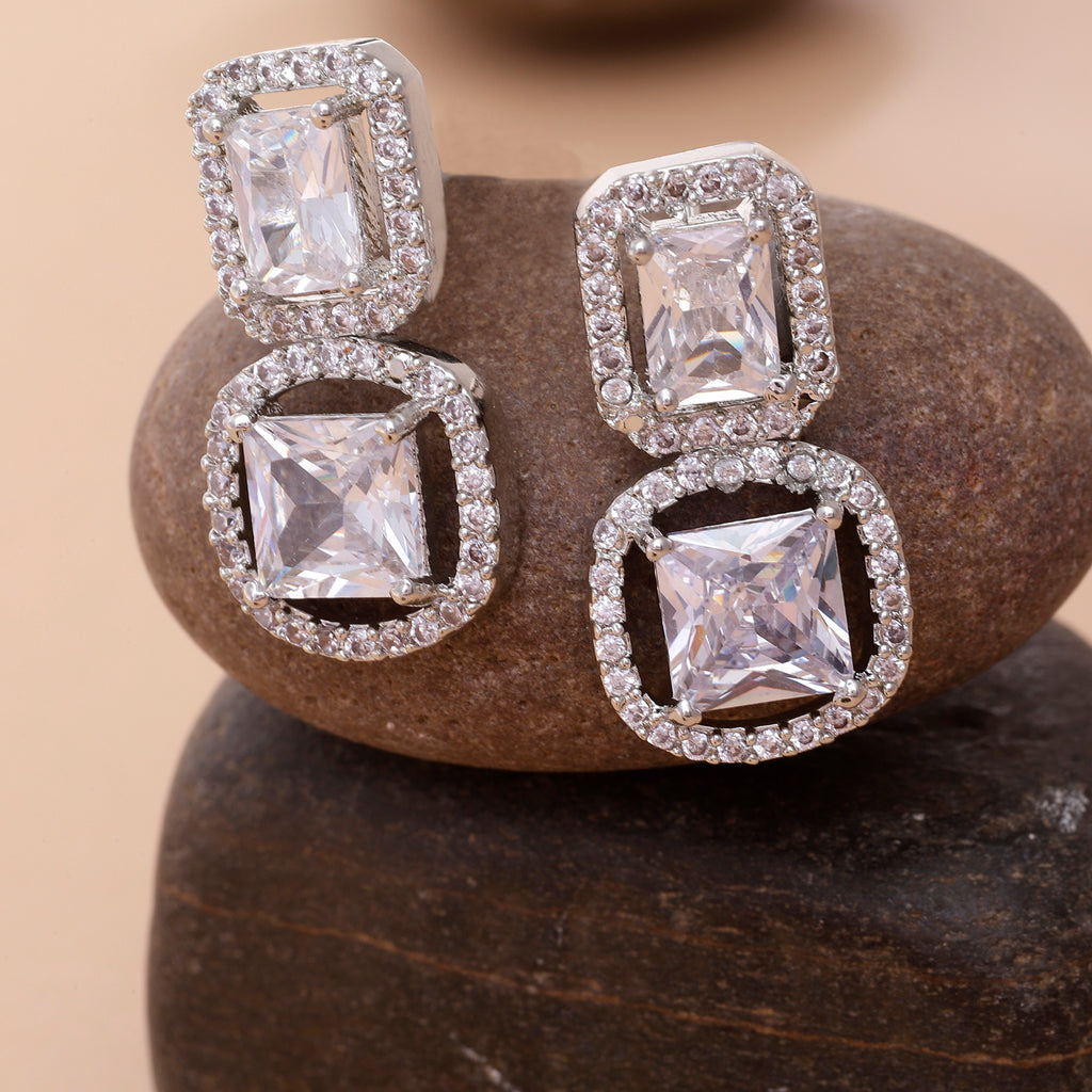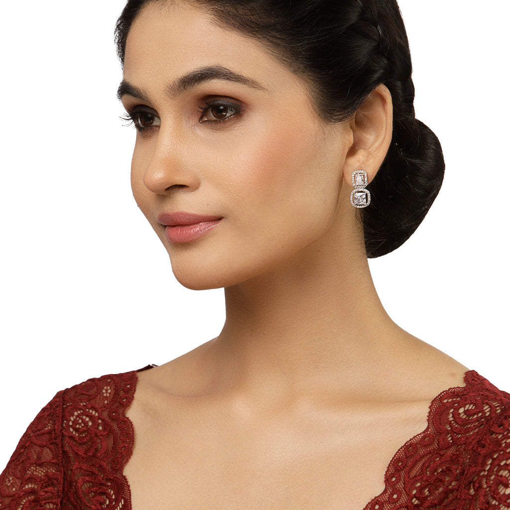 Rhodium-Plated White American Diamond studded Square Shaped Drop Earrings