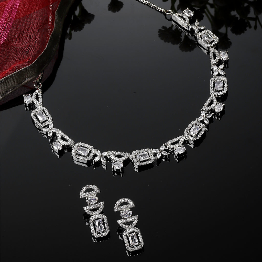 Rhodium-Plated White American Diamonds Studded Boxy Necklace & Earrings Jewellery Set