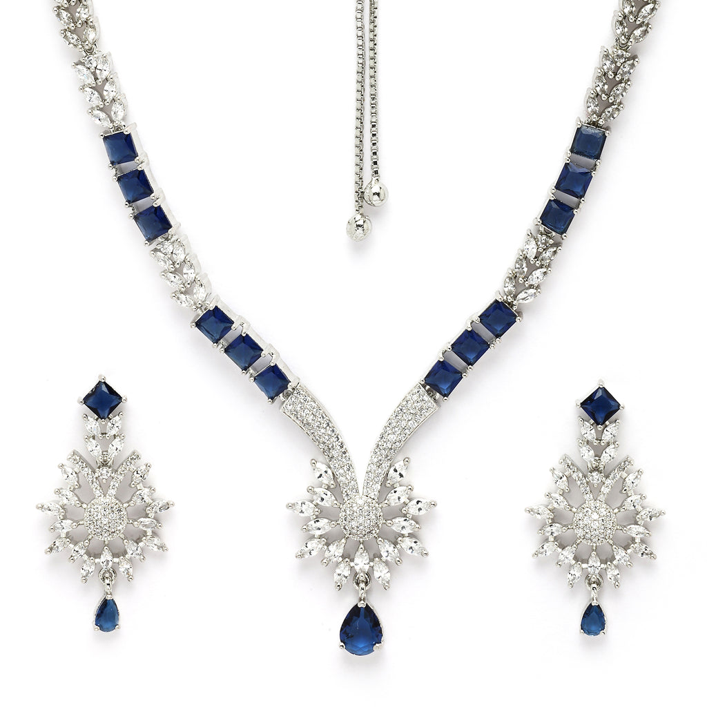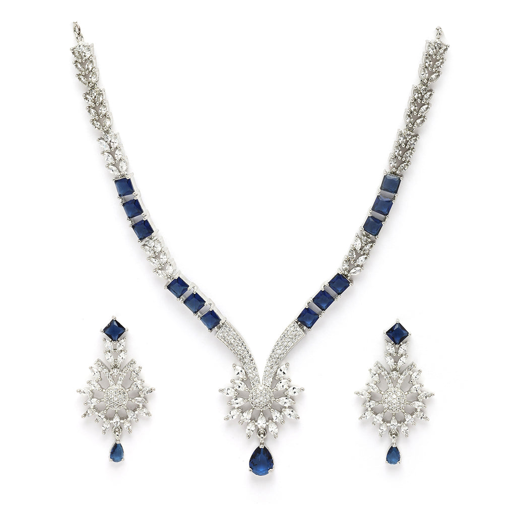 Elegant Floral Design: This rhodium-plated necklace set features a beautiful blend of floral and curved patterns adorned with sparkling blue American diamonds for a timeless look.