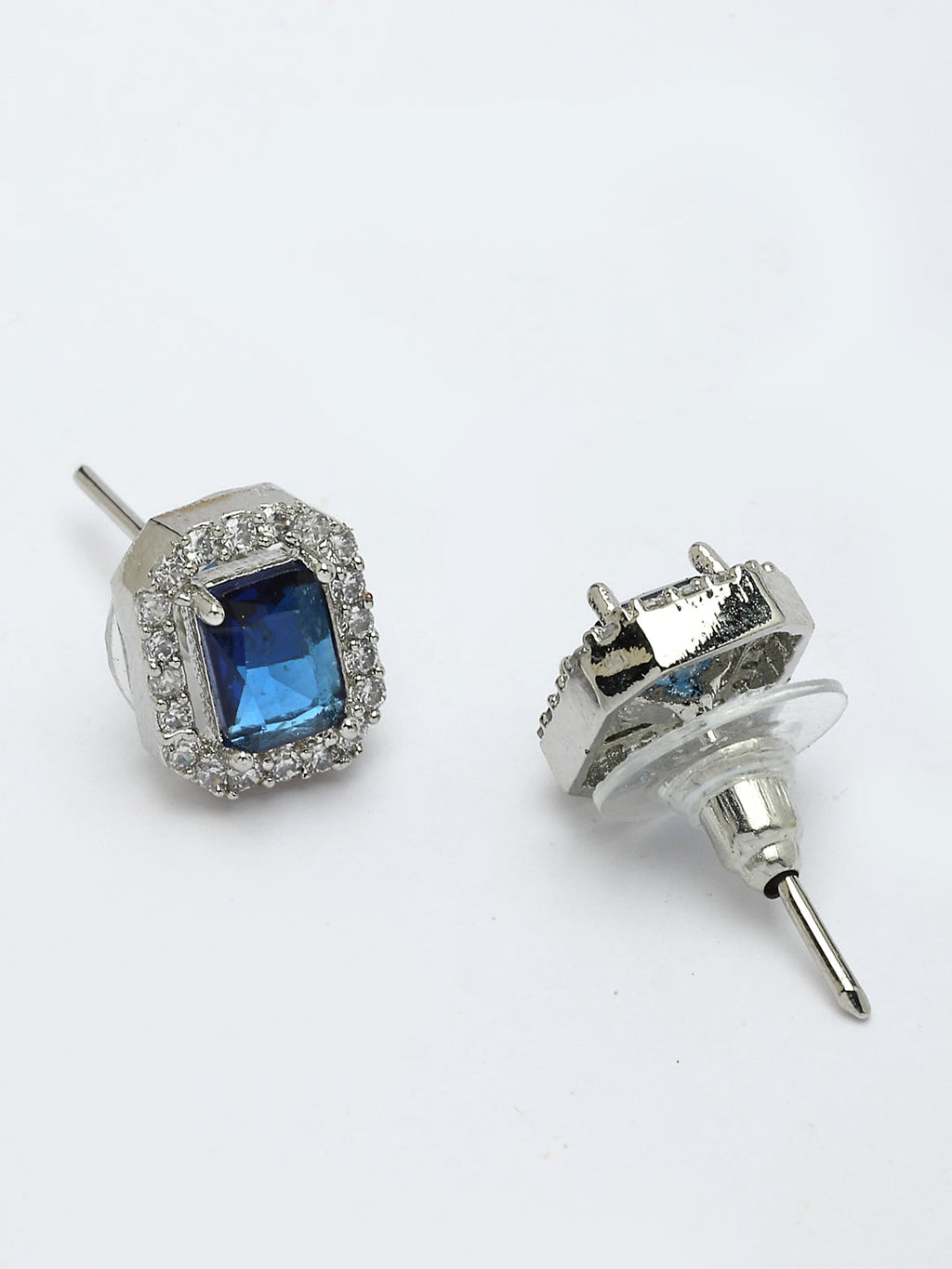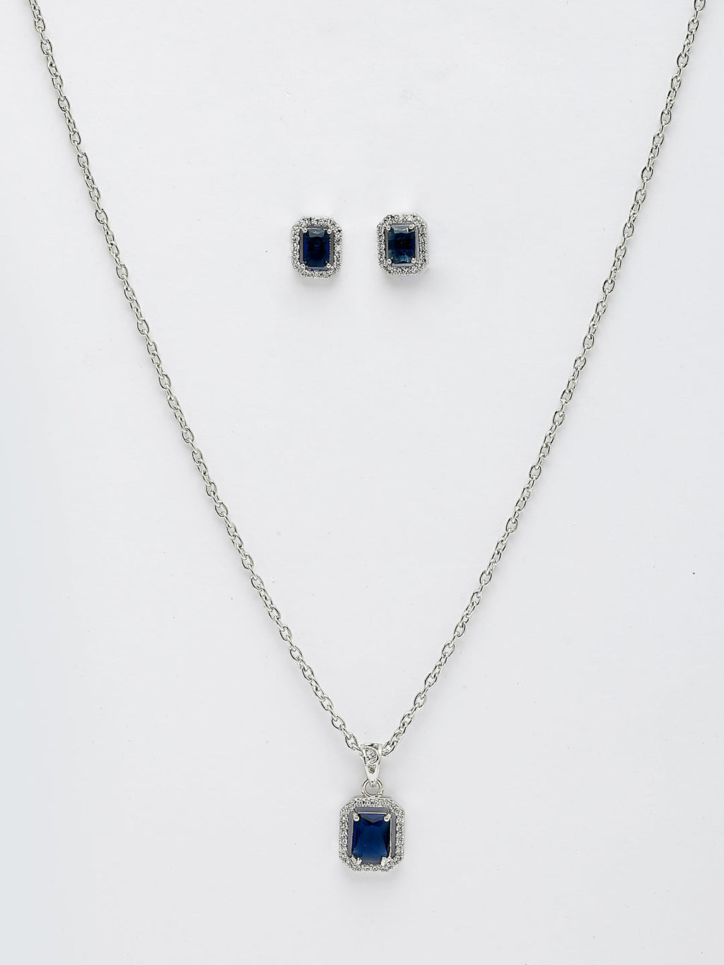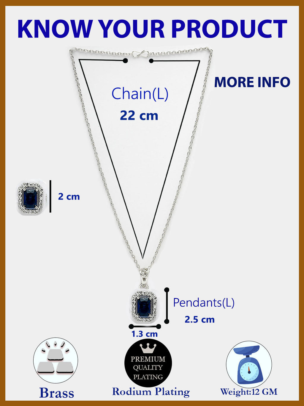 Sleek Rectangular Design: This rhodium-plated pendant set features a stylish rectangular shape, elegantly embellished with a radiant blue American diamond for a sophisticated and modern look.