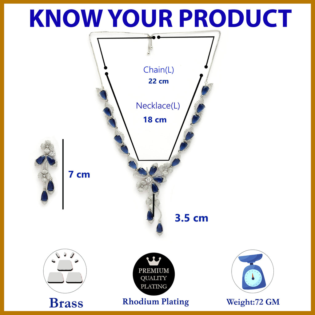 Elegant Floral Design: This rhodium-plated necklace features a beautiful floral design studded with blue and white American diamonds, offering a sophisticated and timeless look.