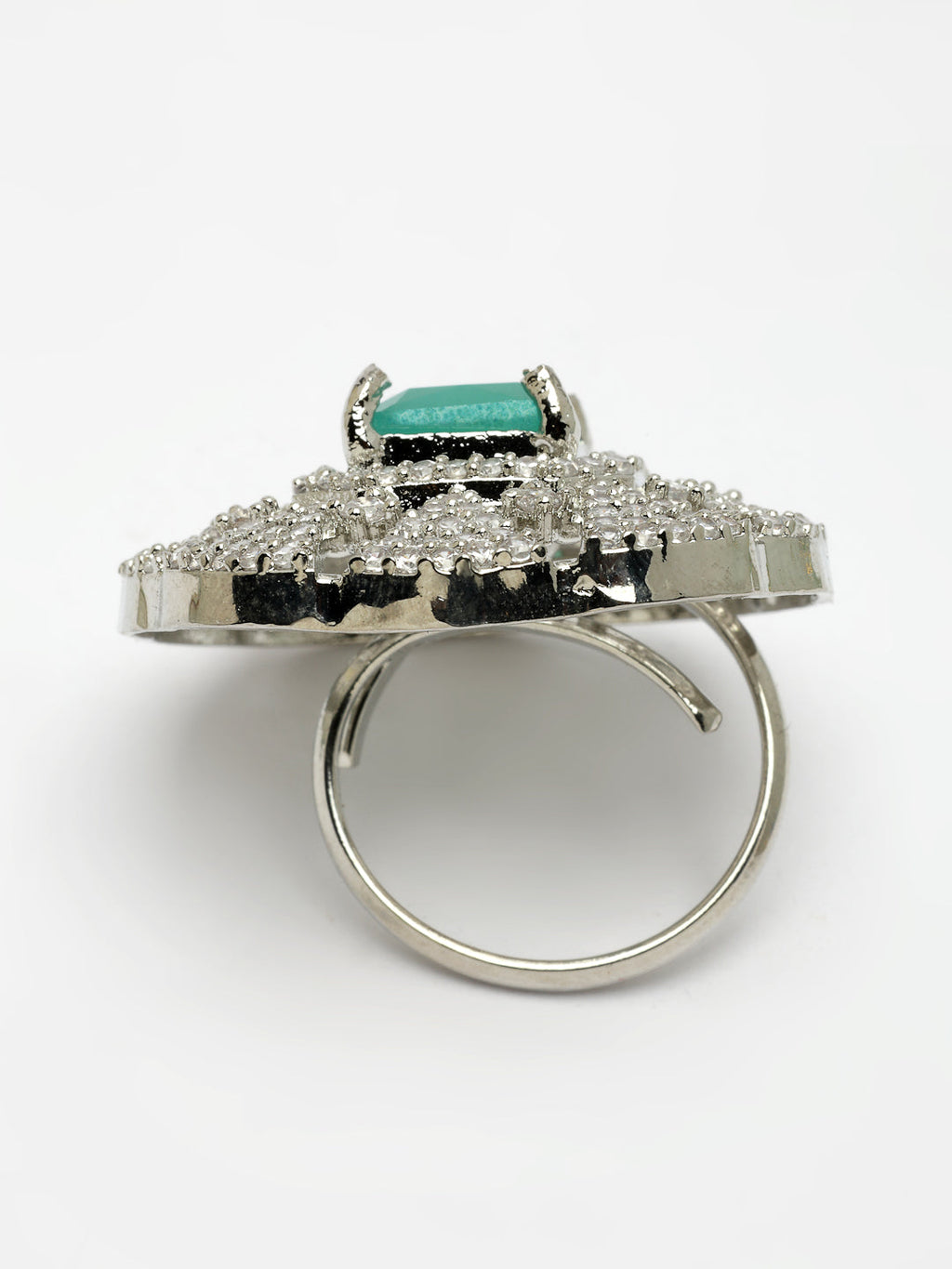 Elegant Chandelier Design: Rhodium-plated necklace set featuring a stunning chandelier design, embellished with sea green stones and white American diamonds for a luxurious look.