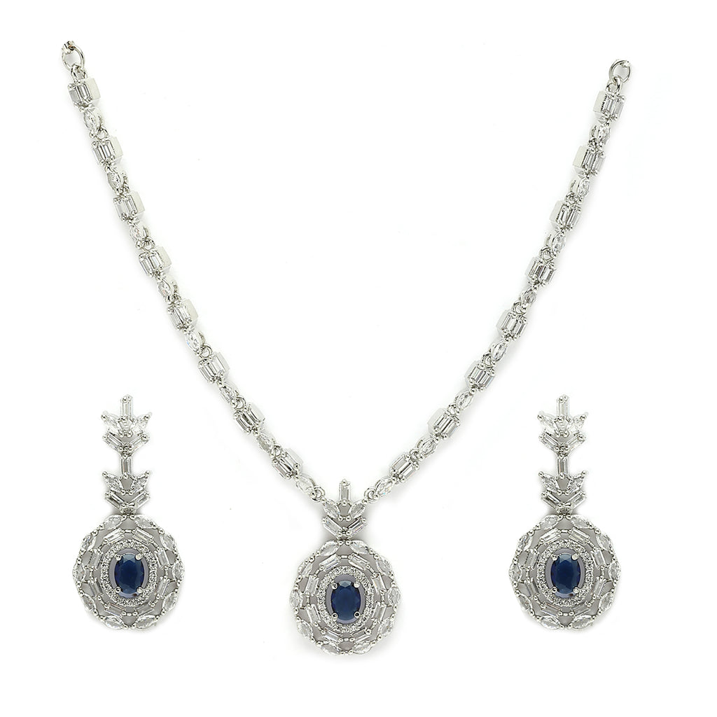 Classy and Elegant Design: Rhodium-plated necklace set featuring a refined design, accented with blue and white AD stones for a sophisticated and striking look.