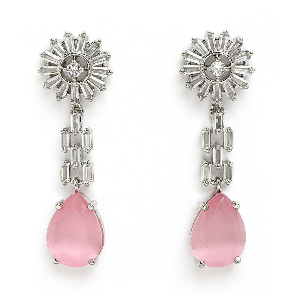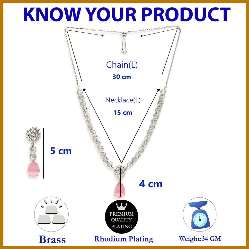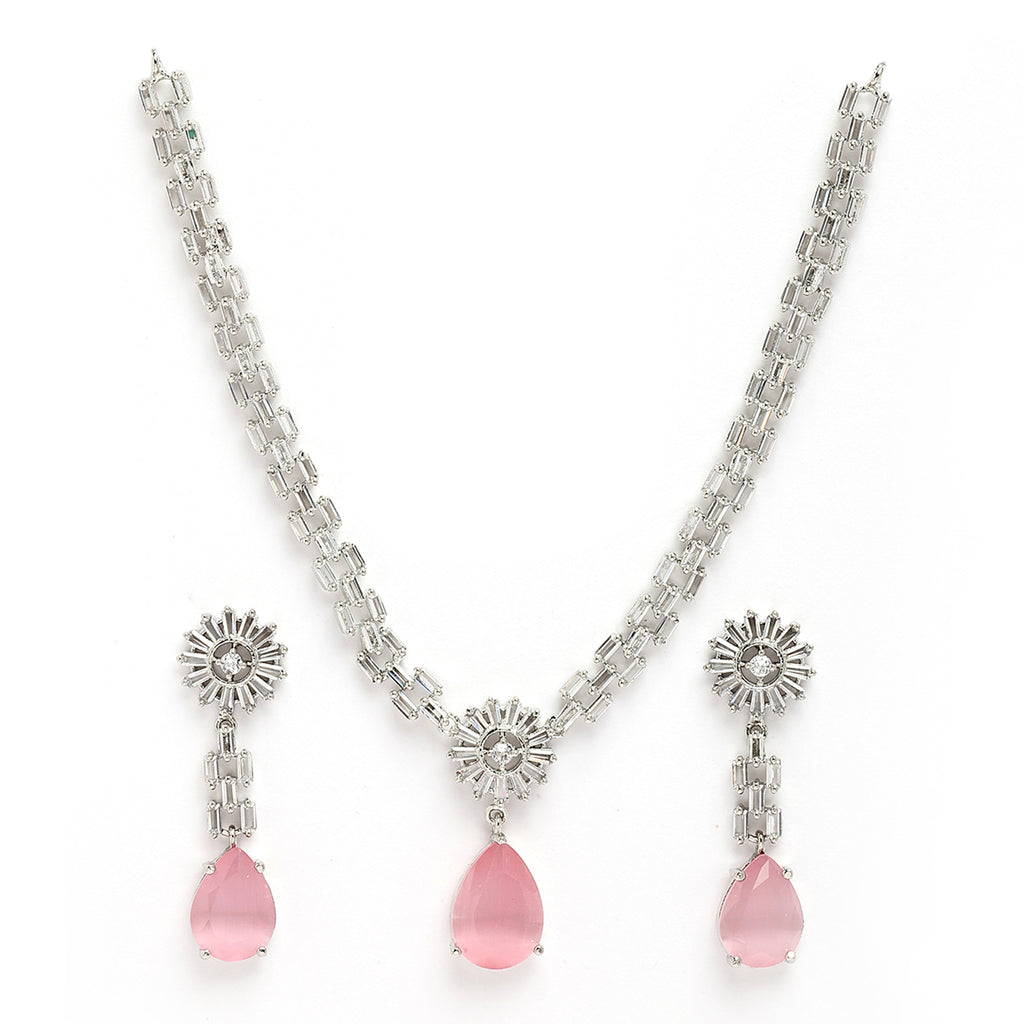 Elegant Design: This rhodium-plated pink necklace and earrings set is adorned with shimmering pink gemstones that catch the light, creating a captivating sparkle that enhances your overall look.