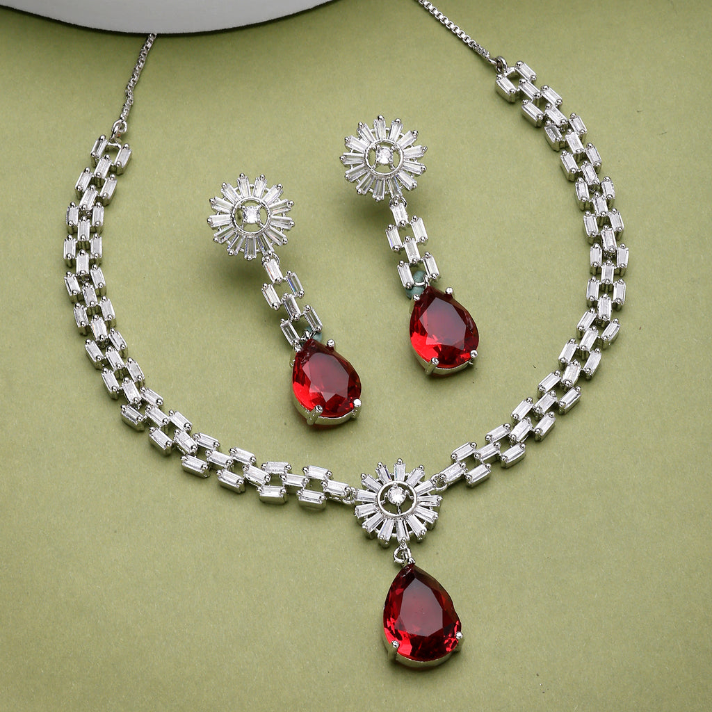 Elegant Design: This rhodium-plated ruby red necklace and earrings set is adorned with shimmering red gemstones that catch the light, creating a captivating sparkle that enhances your overall look.