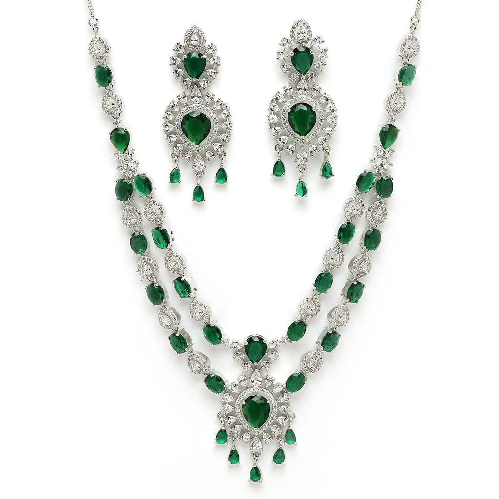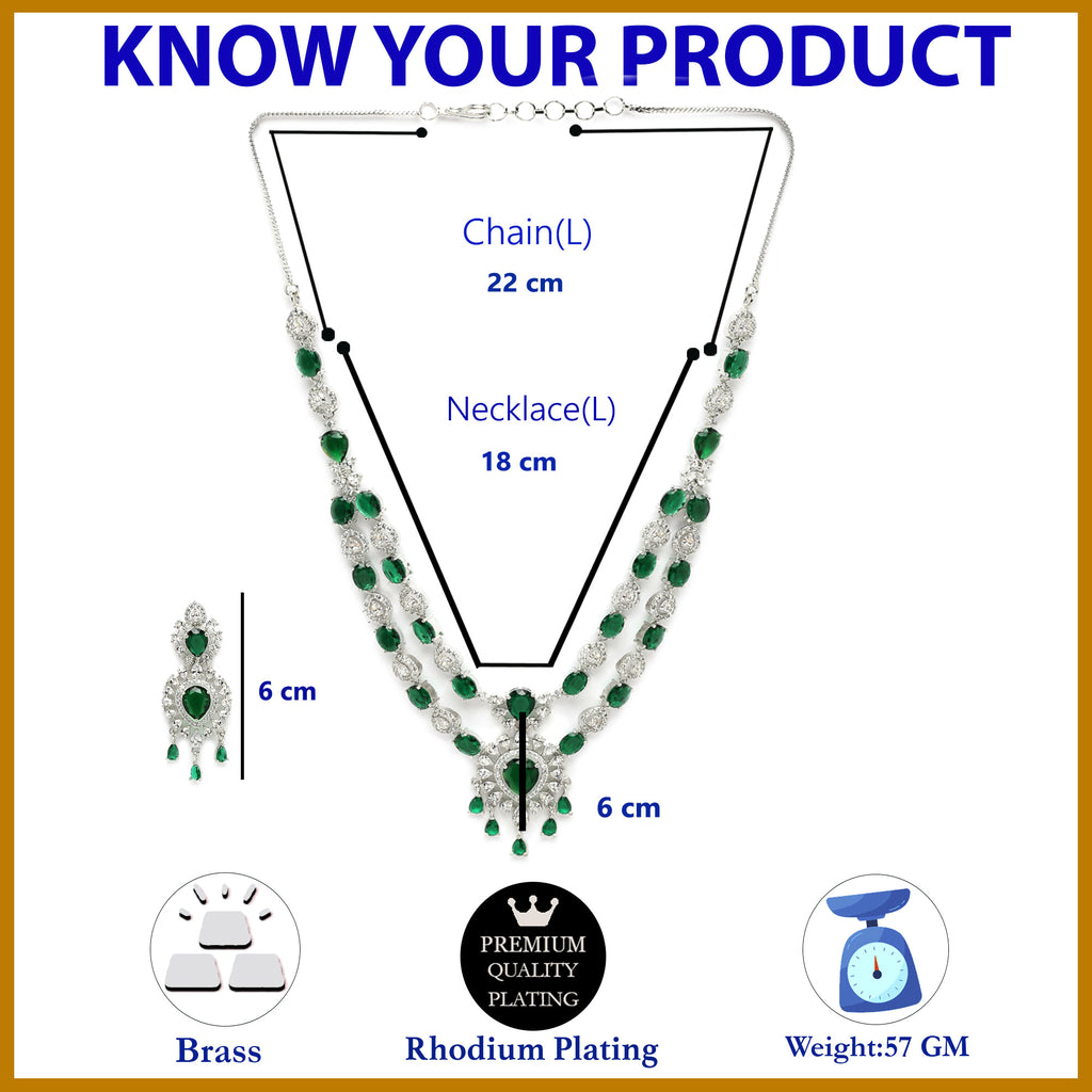 Elegant Emerald Green Design: This rhodium-plated necklace set features captivating emerald green American diamonds, adding a rich pop of color to your outfit.